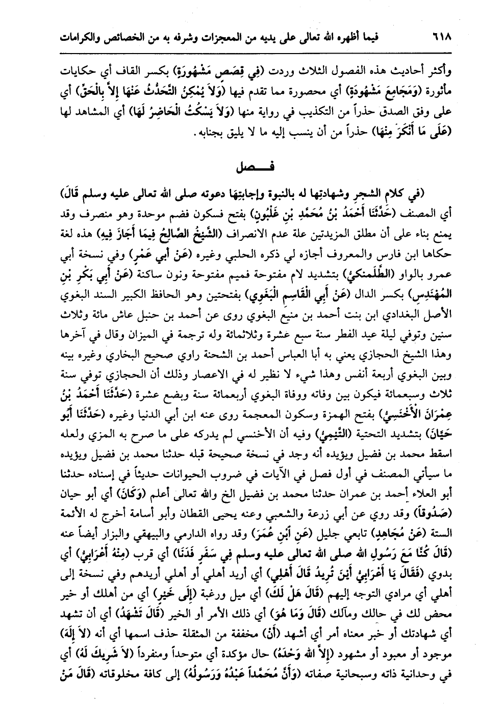 (في كلام الشجر وشهادتها له بالنبوة وإجابتها دعوته صلى الله تعالى عليه وسلم قال) أي المصنف (حدّثنا أحمد بن محمّد بن غلبون) بفتح فسكون فضم موحدة وهو منصرف وقد يمنع بناء على أن مطلق المزيدتين علة عدم الانصراف (الشّيخ الصّالح فيما أجاز فيه) هذه لغة حكاها ابن فارس والمعروف أجازه لي ذكره الحلبي وغيره (عن أبي عمر) وفي نسخة أبي عمرو بالواو (الطّلمنكيّ) بتشديد لام مفتوحة فميم مفتوحة ونون ساكنة (عن أبي بكر بن المهندس) بكسر الدال (عن أبي القاسم البغوي) بفتحتين وهو الحافظ الكبير السند البغوي الأصل البغدادي ابن بنت أحمد بن منيع البغوي روى عن أحمد بن حنبل عاش مائة وثلاث سنين وتوفي ليلة عيد الفطر سنة سبع عشرة وثلاثمائة وله ترجمة في الميزان وقال في آخرها وهذا الشيخ الحجازي يعني به أبا العباس أحمد بن الشحنة راوي صحيح البخاري وغيره بينه وبين البغوي أربعة أنفس وهذا شيء لا نظير له في الاعصار وذلك أن الحجازي توفي سنة ثلاث وسبعمائة فيكون بين وفاته ووفاة البغوي أربعمائة سنة وبضع عشرة (حدّثنا أحمد بن عمران الأخنسيّ) بفتح الهمزة وسكون المعجمة روى عنه ابن أبي الدنيا وغيره (حدّثنا أبو حيّان) بتشديد التحتية (التّيميّ) وفيه أن الأخنسي لم يدركه على ما صرح به المزي ولعله اسقط محمد بن فضيل ويؤيده أنه وجد في نسخة صحيحة قبله حدثنا محمد بن فضيل ويؤيده ما سيأتي المصنف في أول فصل في الآيات في ضروب الحيوانات حديثا في إسناده حَدَّثَنَا أَبُو الْعَلَاءِ أَحْمَدُ بْنُ عِمْرَانَ حَدَّثَنَا محمد بن فضيل الخ والله تعالى أعلم (وكان) أي أبو حيان (صدوقا) وقد روي عن أبي زرعة والشعبي وعنه يحيى القطان وأبو أسامة أخرج له الأئمة الستة (عن مجاهد) تابعي جليل (عن ابن عمر) وقد رواه الدارمي والبيهقي والبزار أيضا عنه (قَالَ كُنَّا مَعَ رَسُولِ اللَّهِ صَلَّى اللَّهُ تعالى عليه وسلم في سفر فدنا) أي قرب (منه أعرابيّ) أي بدوي (فقال يا أعرابيّ أين تريد قال أهلي) أي أريد أهلي أو أهلي أريدهم وفي نسخة إلى أهلي أي مرادي التوجه إليهم (قال هل لك) أي ميل ورغبة (إلى خير) أي من أهلك أو خير محض لك في حالك ومآلك (قال وما هو) أي ذلك الأمر أو الخير (قال تشهد) أي أن تشهد أي شهادتك أو خبر معناه أمر أي أشهد (أن) مخففة من المثقلة حذف اسمها أي أنه (لا إله) موجود أو معبود أو مشهود (إلّا الله وحده) حال مؤكدة أي متوحدا ومنفردا (لا شريك له) أي في وحدانية ذاته وسبحانية صفاته (وأنّ محمّدا عبده ورسوله) إلى كافة مخلوقاته (قال من