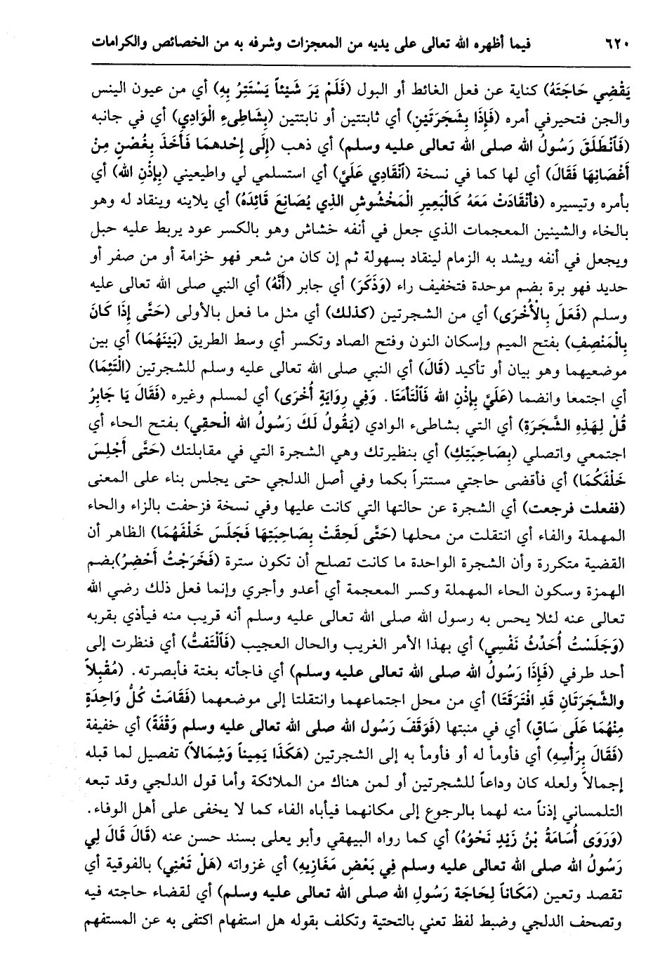 يقضي حاجته) كناية عن فعل الغائط أو البول (فلم ير شيئا يستتر به) أي من عيون الينس والجن فتحير في أمره (فإذا بشجرتين) أي ثابتتين أو نابتتين (بشاطىء الوادي) أي في جانبه (فانطلق رسول الله صلى الله تعالى عليه وسلم) أي ذهب (إلى إحدهما فأخذ بغصن من أغصانها فقال) أي لها كما في نسخة (انقادي عليّ) أي استسلمي لي واطيعيني (بإذن الله) أي بأمره وتيسيره (فَانْقَادَتْ مَعَهُ كَالْبَعِيرِ الْمَخْشُوشِ الَّذِي يُصَانِعُ قَائِدَهُ) أي يلاينه وينقاد له وهو بالخاء والشينين المعجمات الذي جعل في أنفه خشاش وهو بالكسر عود يربط عليه حبل ويجعل في أنفه ويشد به الزمام لينقاد بسهولة ثم إن كان من شعر فهو خزامة أو من صفر أو حديد فهو برة بضم موحدة فتخفيف راء (وذكر) أي جابر (أنّه) أي النبي صلى الله تعالى عليه وسلم (فعل بالأخرى) أي من الشجرتين (كذلك) أي مثل ما فعل بالأولى (حتّى إذا كان بالمنصف) بفتح الميم وإسكان النون وفتح الصاد وتكسر أي وسط الطريق (بينهما) أي بين موضعيهما وهو بيان أو تأكيد (قال) أي النبي صلى الله تعالى عليه وسلم للشجرتين (التئما) أي اجتمعا وانضما (عَلَيَّ بِإِذْنِ اللَّهِ فَالْتَأَمَتَا. وَفِي رِوَايَةٍ أُخْرَى) أي لمسلم وغيره (فقال يا جابر قل لهذه الشّجرة) أي التي بشاطىء الوادي (يقول لك رسول الله الحقي) بفتح الحاء أي اجتمعي واتصلي (بصاحبتك) أي بنظيرتك وهي الشجرة التي في مقابلتك (حتّى أجلس خلفكما) أي فأقضى حاجتي مستترا بكما وفي أصل الدلجي حتى يجلس بناء على المعنى (ففعلت فرجعت) أي الشجرة عن حالتها التي كانت عليها وفي نسخة فزحفت بالزاء والحاء المهملة والفاء أي انتقلت من محلها (حتّى لحقت بصاحبتها فجلس خلفهما) الظاهر أن القضية متكررة وأن الشجرة الواحدة ما كانت تصلح أن تكون سترة (فخرجت أحضر) بضم الهمزة وسكون الحاء المهملة وكسر المعجمة أي أعدو وأجري وإنما فعل ذلك رضي الله تعالى عنه لئلا يحس به رسول الله صلى الله تعالى عليه وسلم أنه قريب منه فيأذي بقربه (وجلست أحدّث نفسي) أي بهذا الأمر الغريب والحال العجيب (فالتفتّ) أي فنظرت إلى أحد طرفي (فإذا رسول الله صلى الله تعالى عليه وسلم) أي فاجأته بغتة فأبصرته. (مقبلا والشّجرتان قد افترقتا) أي من محل اجتماعهما وانتقلتا إلى موضعهما (فقامت كلّ واحدة منهما على ساق) أي في منبتها (فوقف رسول الله صلى الله تعالى عليه وسلم وقفة) أي خفيفة (فقال برأسه) أي فأومأ له أو فأومأ به إلى الشجرتين (هكذا يمينا وشمالا) تفصيل لما قبله إجمالا ولعله كان وداعا للشجرتين أو لمن هناك من الملائكة وأما قول الدلجي وقد تبعه التلمساني إذنا منه لهما بالرجوع إلى مكانهما فيأباه الفاء كما لا يخفى على أهل الوفاء.
