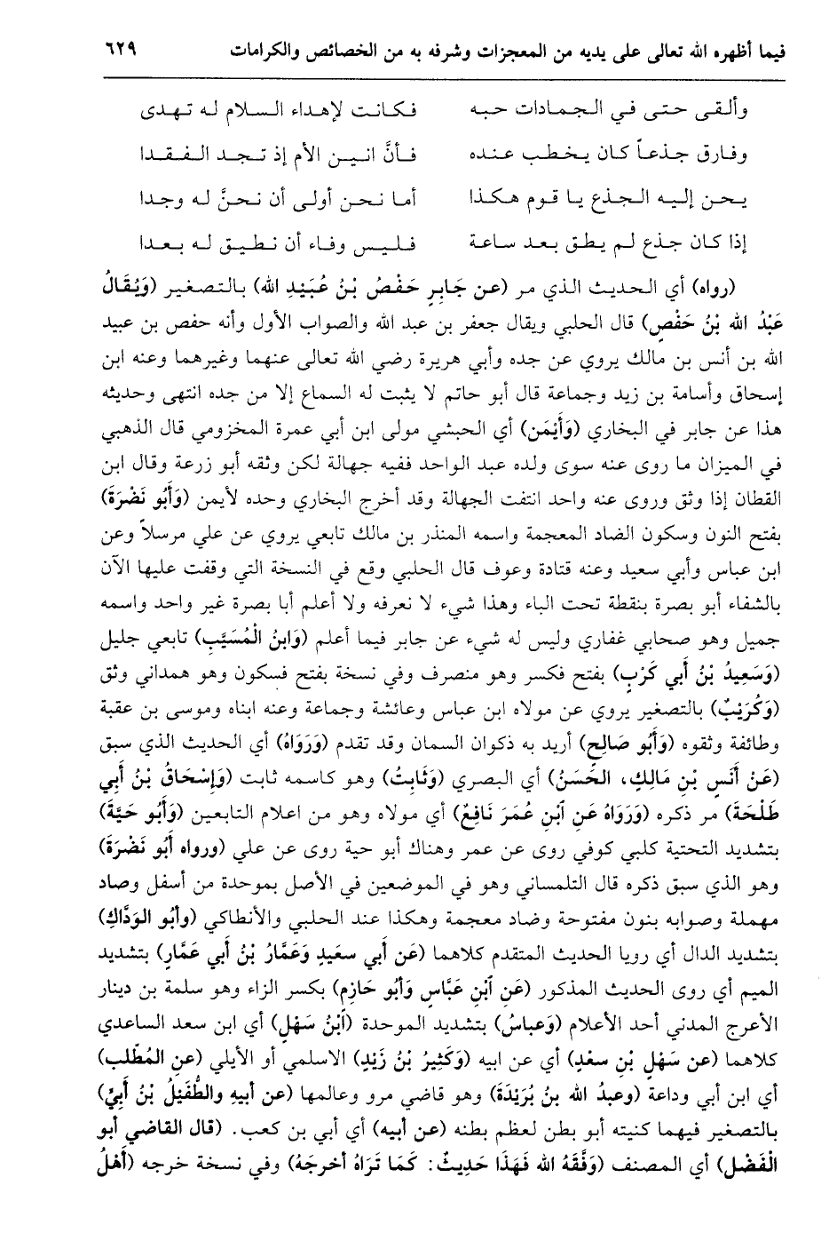 (رواه) أي الحديث الذي مر (عن جابر حفص بن عبيد الله) بالتصغير (ويقال عبد الله بن حفص) قال الحلبي ويقال جعفر بن عبد الله والصواب الأول وأنه حفص بن عبيد الله بن أنس بن مالك يروي عن جده وأبي هريرة رضي الله تعالى عنهما وغيرهما وعنه ابن إسحاق وأسامة بن زيد وجماعة قال أبو حاتم لا يثبت له السماع إلا من جده انتهى وحديثه هذا عن جابر في البخاري (وأيمن) أي الحبشي مولى ابن أبي عمرة المخزومي قال الذهبي في الميزان ما روى عنه سوى ولده عبد الواحد ففيه جهالة لكن وثقه أبو زرعة وقال ابن القطان إذا وثق وروى عنه واحد انتفت الجهالة وقد أخرج البخاري وحده لأيمن (وأبو نضرة) بفتح النون وسكون الضاد المعجمة واسمه المنذر بن مالك تابعي يروي عن علي مرسلا وعن ابن عباس وأبي سعيد وعنه قتادة وعوف قال الحلبي وقع في النسخة التي وقفت عليها الآن بالشفاء أبو بصرة بنقطة تحت الباء وهذا شيء لا نعرفه ولا أعلم أبا بصرة غير واحد واسمه جميل وهو صحابي غفاري وليس له شيء عن جابر فيما أعلم (وابن المسيّب) تابعي جليل (وسعيد بن أبي كرب) بفتح فكسر وهو منصرف وفي نسخة بفتح فسكون وهو همداني وثق (وكريب) بالتصغير يروي عن مولاه ابن عباس وعائشة وجماعة وعنه ابناه وموسى بن عقبة وطائفة وثقوه (وأبو صالح) أريد به ذكوان السمان وقد تقدم (ورواه) أي الحديث الذي سبق (عن أنس بن مالك، الحسن) أي البصري (وثابت) وهو كاسمه ثابت (وإسحاق بن أبي طلحة) مر ذكره (ورواه عن ابن عمر نافع) أي مولاه وهو من اعلام التابعين (وأبو حيّة) بتشديد التحتية كلبي كوفي روى عن عمر وهناك أبو حية روى عن علي (ورواه أبو نضرة) وهو الذي سبق ذكره قال التلمساني وهو في الموضعين في الأصل بموحدة من أسفل وصاد مهملة وصوابه بنون مفتوحة وضاد معجمة وهكذا عند الحلبي والأنطاكي (وأبو الودّاك) بتشديد الدال أي رويا الحديث المتقدم كلاهما (عَنْ أَبِي سَعِيدٍ وَعَمَّارُ بْنُ أَبِي عَمَّارٍ) بتشديد الميم أي روى الحديث المذكور (عن ابن عبّاس وأبو حازم) بكسر الزاء وهو سلمة بن دينار الأعرج المدني أحد الأعلام (وعباس) بتشديد الموحدة (ابن سهل) أي ابن سعد الساعدي كلاهما (عن سهل بن سعد) أي عن ابيه (وكثير بن زيد) الاسلمي أو الأيلي (عن المطّلب) أي ابن أبي وداعة (وعبد الله بن بريدة) وهو قاضي مرو وعالمها (عن أبيه والطّفيل بن أبيّ) بالتصغير فيهما كنيته أبو بطن لعظم بطنه (عن أبيه) أي أبي بن كعب. (قال القاضي أبو الفضل) أي المصنف (وفّقه الله فهذا حديث: كما تراه أخرجه) وفي نسخة خرجه (أهل