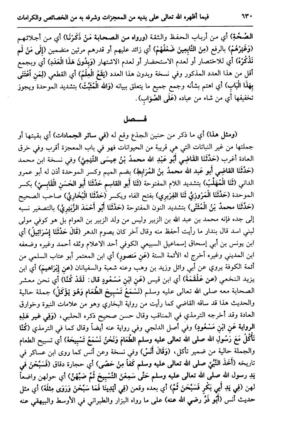 (ومثل هذا) أي ما ذكر من حنين الجذع وقع له (في سائر الجمادات) أي بقيتها أو جملتها من غير النباتات التي هي قريبة من الحيوانات فهو في باب المعجزة أقرب وفي خرق العادة أغرب (حَدَّثَنَا الْقَاضِي أَبُو عَبْدِ اللَّهِ مُحَمَّدُ بْنُ عيسى التّيميّ) وفي نسخة ابن محمد (حَدَّثَنَا الْقَاضِي أَبُو عَبْدِ اللَّهِ مُحَمَّدُ بْنُ المرابط) بضم الميم وكسر الموحدة أذن له أبو عمرو الداني (ثنا المهلّب) بتشديد اللام المفتوحة (ثنا أبو القاسم حدّثنا أبو الحسن القابسيّ) بكسر الموحدة (حدّثنا المروزيّ ثنا الفربري) بفتح الفاء ويكسر (حدّثنا البخاريّ) صاحب الصحيح (حدّثنا محمد بن المثنّى) بتشديد النون المفتوحة (حدّثنا أبو أحمد الزّبيريّ) بالتصغير نسبه إلى جده فإنه محمد بن عبد الله بن الزبير وليس من ولد الزبير بن العوام بل هو كوفي مولى لبني اسد قال بندار ما رأيت أحفظ منه وقال آخر كان يصوم الدهر (قال حدّثنا إسرائيل) أي ابن يونس بن أبي إسحاق إسماعيل السبيعي الكوفي أحد الاعلام وثقه أحمد وغيره وضعفه ابن المديني وغيره أخرج له الأئمة الستة (عن منصور) أي ابن المعتمر أبو عتاب السلمي من أئمة الكوفة يروي عن أبي وائل وزيد بن وهب وعنه شعبة والسفيانان (عن إبراهيم) أي ابن يزيد النخعي (عن علقمة) أي ابن قيس (عن ابن مسعود قال: لقد كنّا) أي نحن معشر الصحابة معه صلى الله تعالى عليه وسلم (نسمع تسبيح الطّعام وهو يؤكل) جملة حالية والحديث هذا قد ساقه القاضي كما رأيت من رواية البخاري وهو من علامات النبوة وخوارق العادة وقد أخرجه الترمذي في المناقب وقال حسن صحيح ذكره الحلبي، (وَفِي غَيْرِ هَذِهِ الرِّوَايَةِ عَنِ ابْنِ مَسْعُودٍ) وفي أصل الدلجي وفي رواية عنه أيضا وقال كما في الترمذي (كُنَّا نَأْكُلُ مَعَ رَسُولِ اللَّهِ صَلَّى اللَّهُ تعالى عليه وسلم الطّعام ونحن نسمع تسبيحه) أي تسبيح الطعام والجملة حالية من ضمير تأكل، (وقال أنس) وفي نسخة وعن أنس كما روى ابن عساكر في تاريخه (أخذ النّبيّ صلى الله تعالى عليه وسلم كفا من حصى) أي حجارة دقاق (فَسَبَّحْنَ فِي يَدِ رَسُولِ اللَّهِ صَلَّى اللَّهُ تعالى عليه وسلم حتّى سمعن التّسبيح ثمّ صبّهنّ) أي حولهن واضعا لهن (في يد أبي بكر فسبّحن ثمّ) أي بعده وقعن (في أيدينا فما سبّحن وروى مثله) أي مثل حديث أنس (أبو ذرّ رضي الله عنه) على ما رواه البزار والطبراني في الأوسط والبيهقي عنه