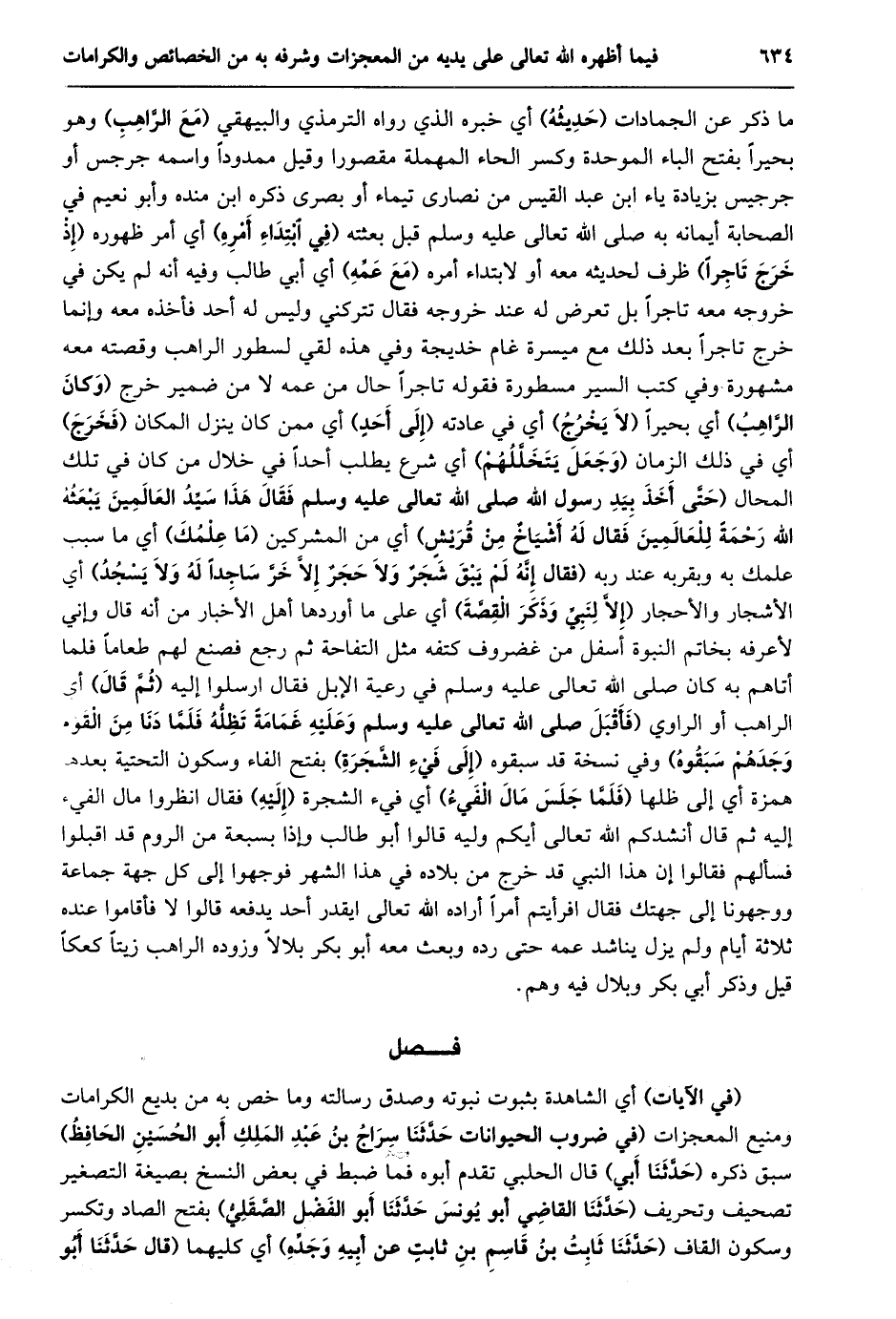 ما ذكر عن الجمادات (حديثه) أي خبره الذي رواه الترمذي والبيهقي (مع الرّاهب) وهو بحيرا بفتح الباء الموحدة وكسر الحاء المهملة مقصورا وقيل ممدودا واسمه جرجس أو جرجيس بزيادة ياء ابن عبد القيس من نصارى تيماء أو بصرى ذكره ابن منده وأبو نعيم في الصحابة أيمانه به صلى الله تعالى عليه وسلم قبل بعثته (في ابتداء أمره) أي أمر ظهوره (إذ خرج تاجرا) ظرف لحديثه معه أو لابتداء أمره (مع عمّه) أي أبي طالب وفيه أنه لم يكن في خروجه معه تاجرا بل تعرض له عند خروجه فقال تتركني وليس له أحد فأخذه معه وإنما خرج تاجرا بعد ذلك مع ميسرة غام خديجة وفي هذه لقي لسطور الراهب وقصته معه مشهورة وفي كتب السير مسطورة فقوله تاجرا حال من عمه لا من ضمير خرج (وكان الرّاهب) أي بحيرا (لا يخرج) أي في عادته (إلى أحد) أي ممن كان ينزل المكان (فخرج) أي في ذلك الزمان (وجعل يتخلّلهم) أي شرع يطلب أحدا في خلال من كان في تلك المحال (حَتَّى أَخَذَ بِيَدِ رَسُولِ اللَّهِ صَلَّى اللَّهُ تعالى عَلَيْهِ وَسَلَّمَ فَقَالَ هَذَا سَيِّدُ الْعَالَمِينَ يَبْعَثُهُ اللَّهُ رَحْمَةً لِلْعَالَمِينَ فَقَالَ لَهُ أَشْيَاخٌ مِنْ قريش) أي من المشركين (ما علمك) أي ما سبب علمك به وبقربه عند ربه (فَقَالَ إِنَّهُ لَمْ يَبْقَ شَجَرٌ وَلَا حَجَرٌ إلّا خرّ ساجدا له ولا يسجد) أي الأشجار والأحجار (إلّا لنبيّ وذكر القصّة) أي على ما أوردها أهل الأخبار من أنه قال وإني لأعرفه بخاتم النبوة أسفل من غضروف كتفه مثل التفاحة ثم رجع فصنع لهم طعاما فلما أتاهم به كان صلى الله تعالى عليه وسلم في رعية الإبل فقال ارسلوا إليه (ثمّ قال) أي الراهب أو الراوي (فأقبل صلى الله تعالى عليه وسلم وعليه غمامة تظلّه فلمّا دنا من القوم وجدهم سبقوه) وفي نسخة قد سبقوه (إلى فيء الشّجرة) بفتح الفاء وسكون التحتية بعدهم همزة أي إلى ظلها (فلمّا جلس مال الفيء) أي فيء الشجرة (إليه) فقال انظروا مال الفيء إليه ثم قال أنشدكم الله تعالى أيكم وليه قالوا أبو طالب وإذا بسبعة من الروم قد اقبلوا فسألهم فقالوا إن هذا النبي قد خرج من بلاده في هذا الشهر فوجهوا إلى كل جهة جماعة ووجهونا إلى جهتك فقال افرأيتم أمرا أراده الله تعالى ايقدر أحد يدفعه قالوا لا فأقاموا عنده ثلاثة أيام ولم يزل يناشد عمه حتى رده وبعث معه أبو بكر بلالا وزوده الراهب زيتا كعكا قيل وذكر أبي بكر وبلال فيه وهم.