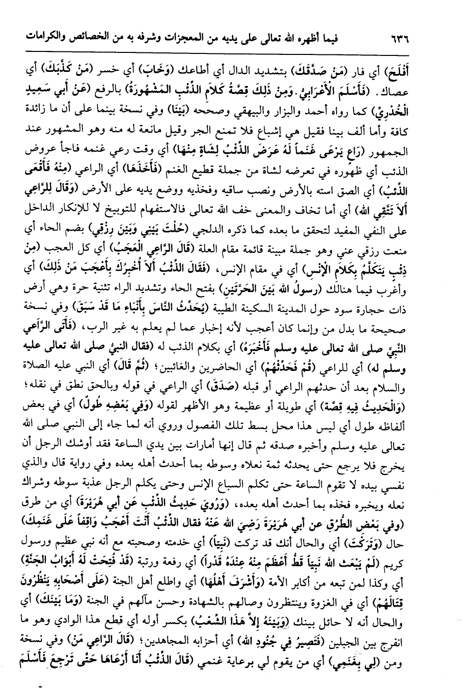 أفلح) أي فار (من صدّقك) بتشديد الدال أي أطاعك (وخاب) أي خسر (من كذّبك) أي عصاك. (فَأَسْلَمَ الْأَعْرَابِيُّ. وَمِنْ ذَلِكَ قِصَّةُ كَلَامِ الذِّئْبِ المشهورة) بالرفع (عن أبي سعيد الخدريّ) كما رواه أحمد والبزار والبيهقي وصححه (بينا) وفي نسخة بينما على أن ما زائدة كافة وأما ألف بينا فقيل هي إشباع فلا تمنع الجر وقيل مانعة له منه وهو المشهور عند الجمهور (رَاعٍ يَرْعَى غَنَمًا لَهُ عَرَضَ الذِّئْبُ لِشَاةٍ منها) أي وقت رعي غنمه فاجأ عروض الذئب أي ظهوره في تعرضه لشاة من جملة قطيع الغنم (فأخذها) أي الراعي (منه فأقعى الذّئب) أي الصق استه بالأرض ونصب ساقيه وفخذيه ووضع يديه على الأرض (وقال للرّاعي ألا تتّقي الله) أي أما تخاف والمعنى خف الله تعالى فالاستفهام للتوبيخ لا للإنكار الداخل على النفي المفيد لتحقق ما بعده كما ذكره الدلجي (حلت بيني وبين رزقي) بضم الحاء أي منعت رزقي عني وهو جملة مبينة قائمة مقام العلة (قال الرّاعي العجب) أي كل العجب (من ذئب يتكلّم بكلام الإنس) أي في مقام الْإِنْسِ، (فَقَالَ الذِّئْبُ أَلَا أُخْبِرُكَ بِأَعْجَبَ مِنْ ذلك) أي وأغرب فيما هنالك (رسول الله بين الحرّتين) بفتح الحاء وتشديد الراء تثنية حرة وهي أرض ذات حجارة سود حول المدينة السكينة الطيبة (يحدّث النّاس بأنباء ما قد سبق) وفي نسخة صحيحة ما بدل من وإنما كان أعجب لأنه إخبار عما لم يعلم به غير الرب، (فأتى الرّاعي النّبيّ صلى الله تعالى عليه وسلم فأخبره) أي بكلام الذئب له (فقال النبيّ صلى الله تعالى عليه وسلم له) أي للراعي (قم فحدّثهم) أي الحاضرين والغائبين؛ (ثمّ قال) أي النبي عليه الصلاة والسلام بعد أن حدثهم الراعي أو قبله (صدق) أي الراعي في قوله وبالحق نطق في نقله؛ (والحديث فيه قصّة) أي طويلة أو عظيمة وهو الأظهر لقوله (وفي بعضه طول) أي في بعض ألفاظه طول أي ليس هذا محل بسط تلك الفصول وروي أنه لما جاء إلى النبي صلى الله تعالى عليه وسلم وأخبره صدقه ثم قال إنها أمارات بين يدي الساعة فقد أوشك الرجل أن يخرج فلا يرجع حتى يحدثه ثمة نعلاه وسوطه بما أحدث أهله بعده وفي رواية قال والذي نفسي بيده لا تقوم الساعة حتى تكلم السباع الإنس وحتى يكلم الرجل عذبة سوطه وشراك نعله ويخبره فخذه بما أحدث أهله بعده، (وروي حديث الذّئب عن أبي هريرة) أي من طرق (وَفِي بَعْضِ الطُّرُقِ عَنْ أَبِي هُرَيْرَةَ رَضِيَ اللَّهُ عَنْهُ فَقَالَ الذِّئْبُ أَنْتَ أَعْجَبُ وَاقِفًا على غنمك) حال (وتركت) أي والحال أنك قد تركت (نبيّا) أي خدمته وصحبته مع أنه نبي عظيم ورسول كريم (لَمْ يَبْعَثِ اللَّهُ نَبِيًّا قَطُّ أَعْظَمَ مِنْهُ عنده قدرا) أي رفعة ورتبة (قد فتحت له أبواب الجنّة) أي وكذا لمن تبعه من أكابر الأمة (وأشرف أهلها) أي واطلع أهل الجنة (على أصحابه ينظرون قتالهم) أي في الغزوة وينتظرون وصالهم بالشهادة وحسن مآلهم في الجنة (وما بينك) أي والحال أنه لا حائل بينك (وبينه إلّا هذا الشّعب) بكسر أوله أي قطع هذا الوادي وهو ما انفرج بين الجبلين (فتصير في جنود الله) أي أحزابه المجاهدين؛ (قال الرّاعي من) وفي نسخة ومن (لي بغنمي) أي من يقوم لي برعاية غنمي (قَالَ الذِّئْبُ أَنَا أَرْعَاهَا حَتَّى تَرْجِعَ فَأَسْلَمَ
