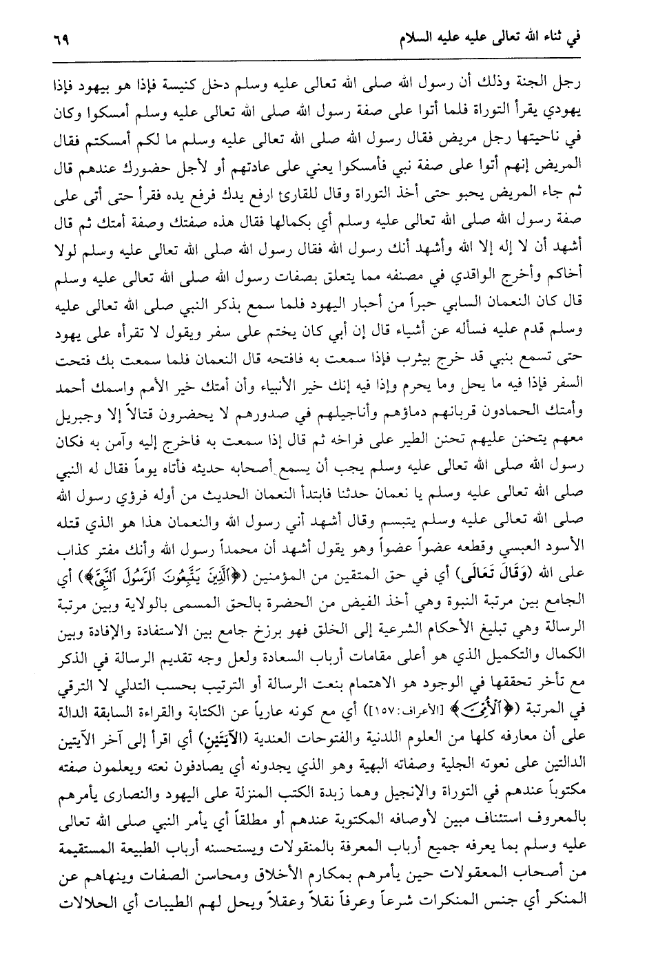 رجل الجنة وذلك أن رسول الله صلى الله تعالى عليه وسلم دخل كنيسة فإذا هو بيهود فإذا يهودي يقرأ التوراة فلما أتوا على صفة رسول الله صلى الله تعالى عليه وسلم أمسكوا وكان في ناحيتها رجل مريض فقال رسول الله صلى الله تعالى عليه وسلم ما لكم أمسكتم فقال المريض إنهم أتوا على صفة نبي فأمسكوا يعني على عادتهم أو لأجل حضورك عندهم قال ثم جاء المريض يحبو حتى أخذ التوراة وقال للقارئ ارفع يدك فرفع يده فقرأ حتى أتى على صفة رسول الله صلى الله تعالى عليه وسلم أي بكمالها فقال هذه صفتك وصفة أمتك ثم قال أشهد أن لا إله إلا الله وأشهد أنك رسول الله فقال رسول الله صلى الله تعالى عليه وسلم لولا أخاكم وأخرج الواقدي في مصنفه مما يتعلق بصفات رسول الله صلى الله تعالى عليه وسلم قال كان النعمان السابي حبرا من أحبار اليهود فلما سمع بذكر النبي صلى الله تعالى عليه وسلم قدم عليه فسأله عن أشياء قال إن أبي كان يختم على سفر ويقول لا تقرأه على يهود حتى تسمع بنبي قد خرج بيثرب فإذا سمعت به فافتحه قال النعمان فلما سمعت بك فتحت السفر فإذا فيه ما يحل وما يحرم وإذا فيه إنك خير الأنبياء وأن أمتك خير الأمم واسمك أحمد وأمتك الحمادون قربانهم دماؤهم وأناجيلهم في صدورهم لا يحضرون قتالا إلا وجبريل معهم يتحنن عليهم تحنن الطير على فراخه ثم قال إذا سمعت به فاخرج إليه وآمن به فكان رسول الله صلى الله تعالى عليه وسلم يجب أن يسمع أصحابه حديثه فأتاه يوما فقال له النبي صلى الله تعالى عليه وسلم يا نعمان حدثنا فابتدأ النعمان الحديث من أوله فرؤي رسول الله صلى الله تعالى عليه وسلم يتبسم وقال أشهد أني رسول الله والنعمان هذا هو الذي قتله الأسود العبسي وقطعه عضوا عضوا وهو يقول أشهد أن محمدا رسول الله وأنك مفتر كذاب على الله (وقال تعالى) أي في حق المتقين من المؤمنين (الَّذِينَ يَتَّبِعُونَ الرَّسُولَ النَّبِيَّ) أي الجامع بين مرتبة النبوة وهي أخذ الفيض من الحضرة بالحق المسمى بالولاية وبين مرتبة الرسالة وهي تبليغ الأحكام الشرعية إلى الخلق فهو برزخ جامع بين الاستفادة والإفادة وبين الكمال والتكميل الذي هو أعلى مقامات أرباب السعادة ولعل وجه تقديم الرسالة في الذكر مع تأخر تحققها في الوجود هو الاهتمام بنعت الرسالة أو الترتيب بحسب التدلي لا الترقي في المرتبة (الْأُمِّيَّ [الأعراف: 157] ) أي مع كونه عاريا عن الكتابة والقراءة السابقة الدالة على أن معارفه كلها من العلوم اللدنية والفتوحات العندية (الآيتين) أي اقرأ إلى آخر الآيتين الدالتين على نعوته الجلية وصفاته البهية وهو الذي يجدونه أي يصادفون نعته ويعلمون صفته مكتوبا عندهم في التوراة والإنجيل وهما زبدة الكتب المنزلة على اليهود والنصارى يأمرهم بالمعروف استئناف مبين لأوصافه المكتوبة عندهم أو مطلقا أي يأمر النبي صلى الله تعالى عليه وسلم بما يعرفه جميع أرباب المعرفة بالمنقولات ويستحسنه أرباب الطبيعة المستقيمة من أصحاب المعقولات حين يأمرهم بمكارم الأخلاق ومحاسن الصفات وينهاهم عن المنكر أي جنس المنكرات شرعا وعرفا نقلا وعقلا ويحل لهم الطيبات أي الحلالات