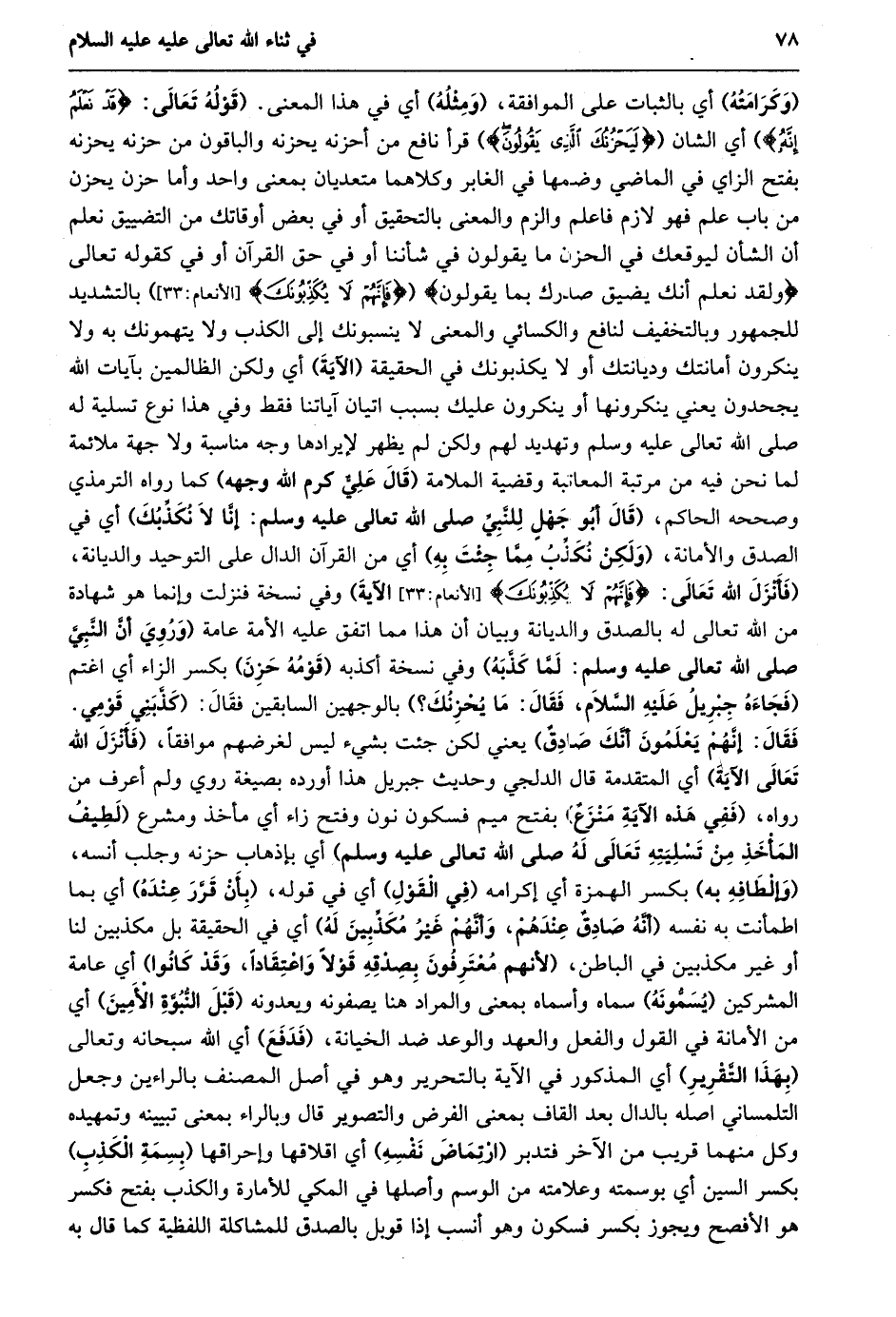 (وكرامته) أي بالثبات على الموافقة، (ومثله) أي في هذا المعنى. (قوله تعالى: قَدْ نَعْلَمُ إِنَّهُ) أي الشان (لَيَحْزُنُكَ الَّذِي يَقُولُونَ) قرأ نافع من أحزنه يحزنه والباقون من حزنه يحزنه بفتح الزاي في الماضي وضمها في الغابر وكلاهما متعديان بمعنى واحد وأما حزن يحزن من باب علم فهو لازم فاعلم والزم والمعنى بالتحقيق أو في بعض أوقاتك من التضييق نعلم أن الشأن ليوقعك في الحزن ما يقولون في شأننا أو في حق القرآن أو في كقوله تَعَالَى وَلَقَدْ نَعْلَمُ أَنَّكَ يَضِيقُ صَدْرُكَ بِما يَقُولُونَ (فَإِنَّهُمْ لا يُكَذِّبُونَكَ [الأنعام: 33] ) بالتشديد للجمهور وبالتخفيف لنافع والكسائي والمعنى لا ينسبونك إلى الكذب ولا يتهمونك به ولا ينكرون أمانتك وديانتك أو لا يكذبونك في الحقيقة (الآية) أي ولكن الظالمين بآيات الله يجحدون يعني ينكرونها أو ينكرون عليك بسبب اتيان آياتنا فقط وفي هذا نوع تسلية له صلى الله تعالى عليه وسلم وتهديد لهم ولكن لم يظهر لإيرادها وجه مناسبة ولا جهة ملائمة لما نحن فيه من مرتبة المعاتبة وقضية الملامة (قال عليّ كرم الله وجهه) كما رواه الترمذي وصححه الحاكم، (قال أبو جهل للنّبيّ صلى الله تعالى عليه وسلم: إنّا لا نكذّبك) أي في الصدق والأمانة، (ولكن نكذّب ممّا جئت به) أي من القرآن الدال على التوحيد والديانة، (فَأَنْزَلَ اللَّهُ تَعَالَى: فَإِنَّهُمْ لَا يُكَذِّبُونَكَ [الْأَنْعَامِ: 33] الآية) وفي نسخة فنزلت وإنما هو شهادة من الله تعالى له بالصدق والديانة وبيان أن هذا مما اتفق عليه الأمة عامة (وروي أنّ النّبيّ صلى الله تعالى عليه وسلم: لمّا كذّبه) وفي نسخة أكذبه (قومه حزن) بكسر الزاء أي اغتم (فَجَاءَهُ جِبْرِيلُ عَلَيْهِ السَّلَامُ، فَقَالَ: مَا يُحْزِنُكَ؟) بالوجهين السابقين فقال: (كَذَّبَنِي قَوْمِي.