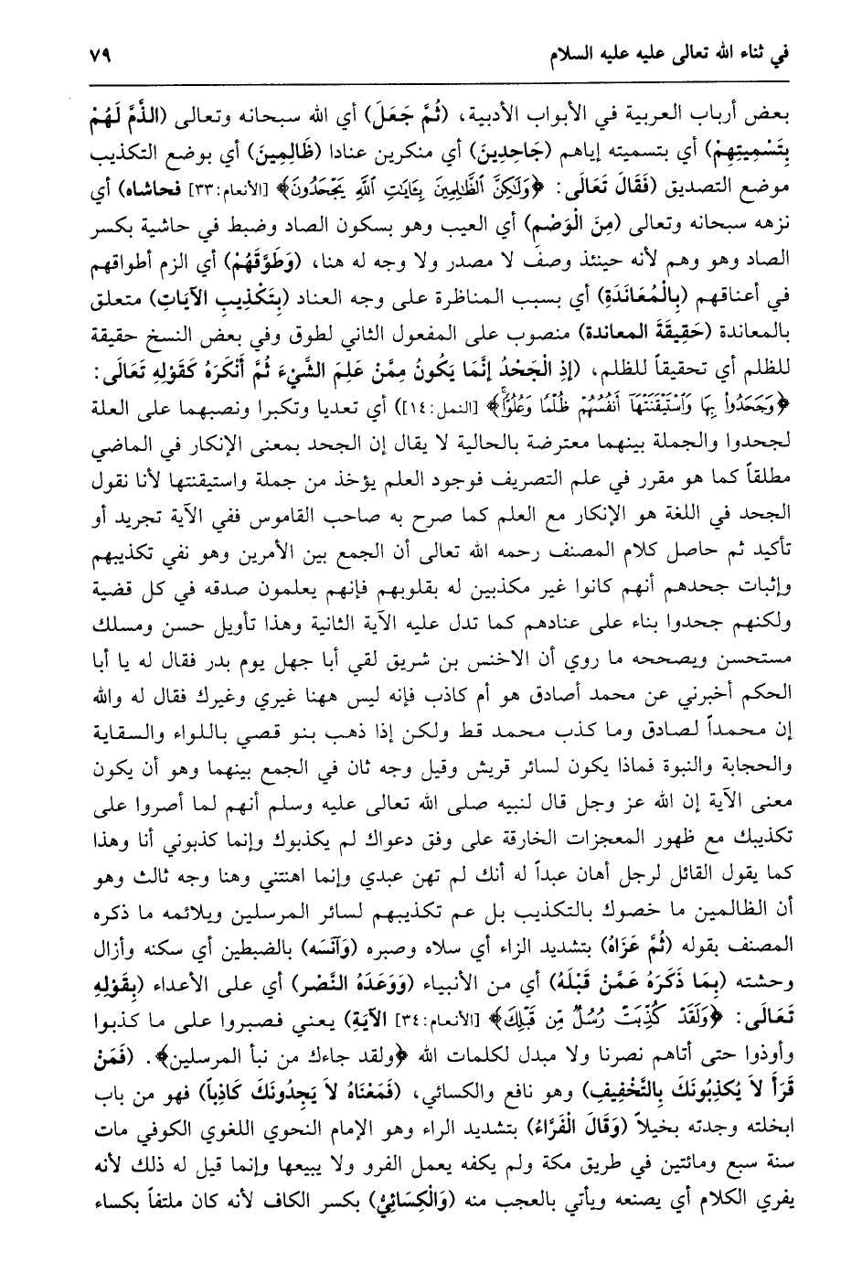 وَجَحَدُوا بِها وَاسْتَيْقَنَتْها أَنْفُسُهُمْ ظُلْماً وَعُلُوًّا [النمل: 14] ) أي تعديا وتكبرا ونصبهما على العلة لجحدوا والجملة بينهما معترضة بالحالية لا يقال إن الجحد بمعنى الإنكار في الماضي مطلقا كما هو مقرر في علم التصريف فوجود العلم يؤخذ من جملة واستيقنتها لأنا نقول الجحد في اللغة هو الإنكار مع العلم كما صرح به صاحب القاموس ففي الآية تجريد أو تأكيد ثم حاصل كلام المصنف رحمه الله تعالى أن الجمع بين الأمرين وهو نفي تكذيبهم وإثبات جحدهم أنهم كانوا غير مكذبين له بقلوبهم فإنهم يعلمون صدقه في كل قضية ولكنهم جحدوا بناء على عنادهم كما تدل عليه الآية الثانية وهذا تأويل حسن ومسلك مستحسن ويصححه ما روي إِنَّ الْأَخْنَسَ بْنَ شُرَيْقٍ لَقِيَ أَبَا جَهْلٍ يَوْمَ بَدْرٍ فَقَالَ لَهُ يَا أَبَا الْحَكَمِ أخبرني عن محمد أصادق هو أم كاذب فإنه ليس ههنا غيري وغيرك فقال له وَاللَّهِ إِنَّ مُحَمَّدًا لَصَادِقٌ وَمَا كَذَبَ مُحَمَّدٌ قط ولكن إذا ذهب بنو قصي باللواء والسقاية والحجابة والنبوة فماذا يكون لسائر قريش وقيل وجه ثان في الجمع بينهما وهو أن يكون معنى الآية إن الله عز وجل قال لنبيه صلى الله تعالى عليه وسلم أنهم لما أصروا على تكذيبك مع ظهور المعجزات الخارقة على وفق دعواك لم يكذبوك وإنما كذبوني أنا وهذا كما يقول القائل لرجل أهان عبدا له أنك لم تهن عبدي وإنما اهنتني وهنا وجه ثالث وهو أن الظالمين ما خصوك بالتكذيب بل عم تكذيبهم لسائر المرسلين ويلائمه ما ذكره المصنف بقوله (ثمّ عزاه) بتشديد الزاء أي سلاه وصبره (وآنسه) بالضبطين أي سكنه وأزال وحشته (بما ذكره عمّن قبله) أي من الأنبياء (ووعده النّصر) أي على الأعداء (بِقَوْلِهِ تَعَالَى: وَلَقَدْ كُذِّبَتْ رُسُلٌ مِنْ قَبْلِكَ [الأنعام: 34] الآية) يعني فصبروا على ما كذبوا وأوذوا حتى أتاهم نصرنا ولا مبدل لكلمات الله وَلَقَدْ جاءَكَ مِنْ نَبَإِ الْمُرْسَلِينَ. (فمن قرأ لا يكذبونك بالتّخفيف) وهو نافع والكسائي، (فمعناه لا يجدونك كاذبا) فهو من باب ابخلته وجدته بخيلا (وقال الفرّاء) بتشديد الراء وهو الإمام النحوي اللغوي الكوفي مات سنة سبع ومائتين في طريق مكة ولم يكفه يعمل الفرو ولا يبيعها وإنما قيل له ذلك لأنه يفري الكلام أي يصنعه ويأتي بالعجب منه (والكسائيّ) بكسر الكاف لأنه كان ملتفا بكساء