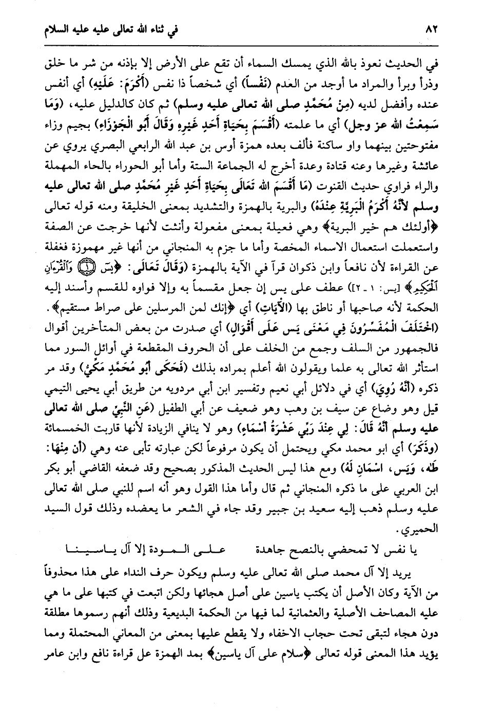 طه، ويس، اسمان له) ومع هذا ليس الحديث المذكور بصحيح وقد ضعفه القاضي أبو بكر ابن العربي على ما ذكره المنجاني ثم قال وأما هذا القول وهو أنه اسم للنبي صلى الله تعالى عليه وسلم ذهب إليه سعيد بن جبير وقد جاء في الشعر ما يعضده وذلك قول السيد الحميري.