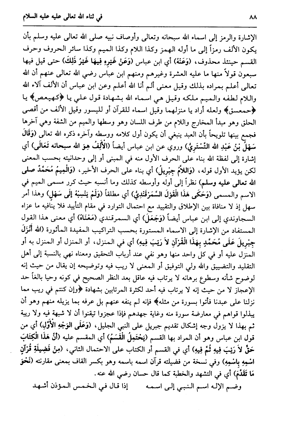 الإشارة والرمز إلى اسماء الله سبحانه وتعالى وأوصاف نبيه صلى الله تعالى عليه وسلم بأن يكون الألف رمزا إلى ما أوله الهمز وكذا اللام وكذا الميم وكذا سائر الحروف وحرف القسم حينئذ محذوف، (وعنه) أي ابن عباس (وعن غيره فيها غير ذلك) حتى قيل فيها سبعون قولا منها ما عليه العشرة وغيرهم ومنهم ابن عباس رضي الله تعالى عنهم أن الله تعالى أعلم بمراده بذلك وقيل معنى ألم أنا الله أعلم وعن ابن عباس أن الألف آلاء الله واللام لطفه والميم ملكه وقيل هي اسماء الله بشهادة قول علي يا كهيعص يا حم عسق ولعله أراد يا منزلهما وقيل اسماء للقرآن أو لليسور وقيل الألف من أقصى الحلق وهو مبدأ المخارج واللام من طرف اللسان وهو وسطها والميم من الشفة وهي آخرها فجمع بينها تلويحا بأن العبد ينبغي أن يكون أول كلامه ووسطه وآخره ذكره الله تعالى (وقال سهل بن عبد الله التّستريّ) وروي عن ابن عباس أيضا (الألف هو الله سبحانه تعالى) أي إشارة إلى لفظة الله بناء على الحرف الأول منه في المبنى أو إلى وحدانيته بحسب المعنى لكن يؤيد الأول قوله، (واللّام جبريل) أي بناء على الحرف الأخير، (والميم محمّد صلى الله تعالى عليه وسلم) نظرا إلى أوله وأوسطه كذلك وما أنسبه حيث كرر مسمى الميم في الاسم والمسمى (وحكى هذا القول السّمرقنديّ) أي مطلقا (ولم ينسبه إلى سهل) وهذا أمر سهل إذ لا منافاة بين الإطلاق والتقييد مع احتمال التوارد في مقام التأييد فلا ينافيه ما عزاه السجاوندي إلى ابن عباس أيضا (وجعل) أي السمرقندي (معناه) أي معنى هذا القول المستفاد من الإشارة إلى الاسماء المستورة بحسب التراكيب المفيدة المأثورة (اللَّهُ أَنْزَلَ جِبْرِيلَ عَلَى مُحَمَّدٍ بِهَذَا الْقُرْآنِ لا ريب فيه) أي في المنزل، أو المنزل أو المنزل به أو المنزل عليه أو في كل واحد منها وهو نفي عند أرباب التحقيق ومعناه نهي بالنسبة إلى أهل التقليد والتضييق والله ولي التوفيق أو المعنى لا ريب فيه وتوضيحه إن يقال من حيث إنه لوضوح شأنه وسطوع برهانه لا يرتاب فيه عاقل بعد النظر الصحيح في كونه وحيا بالغا حد الإعجاز لا من حيث إنه لا يرتاب فيه أحد لكثرة المرتابين بشهادة وَإِنْ كُنْتُمْ فِي رَيْبٍ مِمَّا نَزَّلْنا عَلى عَبْدِنا فَأْتُوا بِسُورَةٍ مِنْ مِثْلِهِ فإنه لم ينفه عنهم بل عرفه بما يزيله منهم وهو أن يبذلوا قواهم في معارضة سورة منه وغاية جهدهم فإذا عجزوا تيقنوا أن لا شبهة فيه ولا ريبة ثم بهذا لا يزول وجه إشكال تقديم جبريل على النبي الجليل، (وعلى الوجه الأوّل) أي من قول ابن عباس وهو أن المراد بها القسم (يحتمل القسم) أي المقسم عليه (أَنَّ هَذَا الْكِتَابَ حَقٌّ لَا رَيْبَ فِيهِ ثمّ فيه) أي في القسم أو الكتاب على الاحتمال الثاني، (من فضيلة قرآن اسمه باسمه) وفي نسخة من فضيلته قرآن اسمه باسمه وهو بكسر القاف بمعنى مقارنته (نحو ما تقدّم) أي في التشهد والخطبة كما قال حسان رضي الله عنه.
