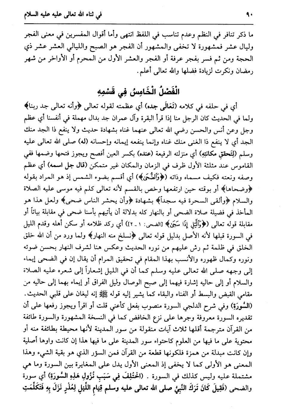 ما ذكر تنافر في النظم وعدم تناسب في اللفظ انتهى وأما أقوال المفسرين في معنى الفجر وليال عشر فمشهورة لا تخفى والمشهور أن الفجر هو الصبح والليالي العشر ذي الحجة ومن ثم فسر بفجر عرفة أو الفجر والعشر الأول من المحرم أو الأواخر من شهر رمضان ونكرت لزيادة فضلها والله تعالى أعلم.