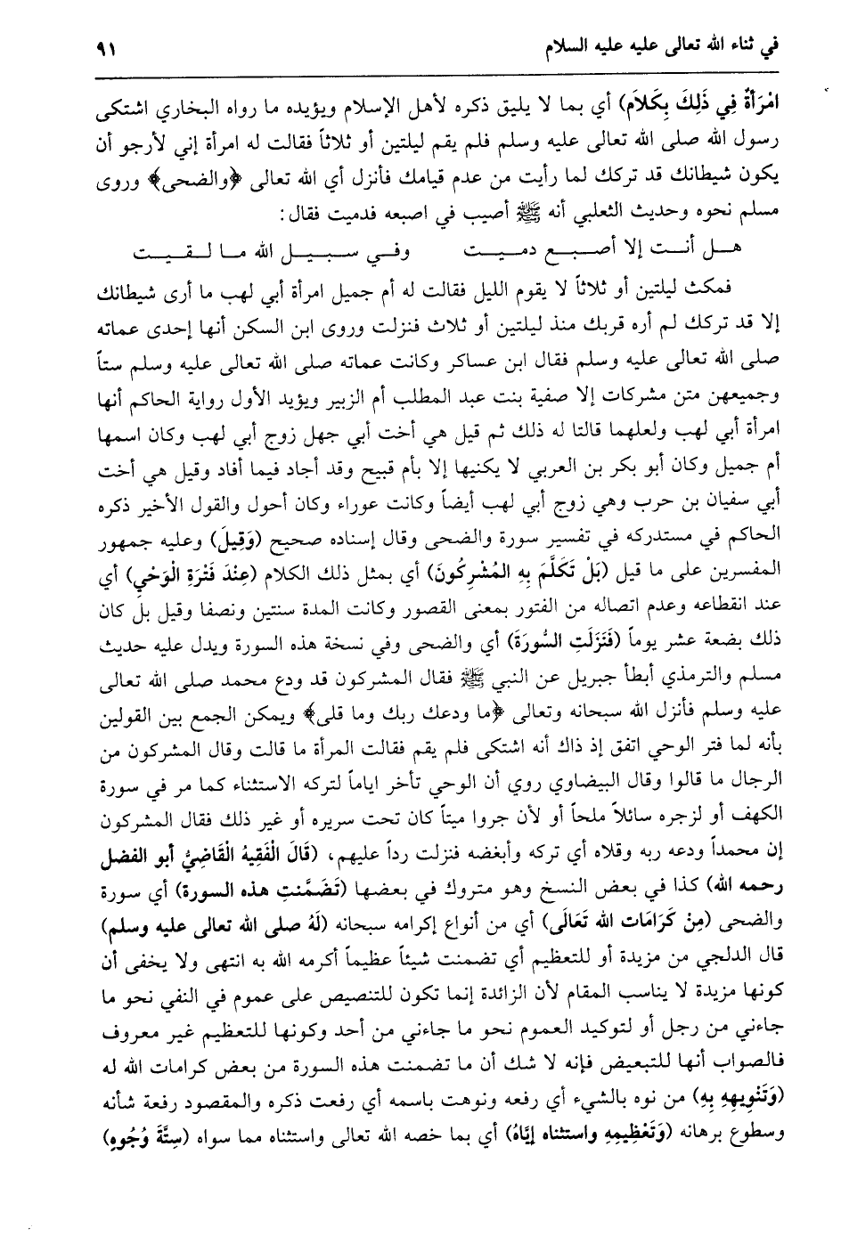 امرأة في ذلك بكلام) أي بما لا يليق ذكره لأهل الإسلام ويؤيده ما رواه البخاري اشتكى رسول الله صلى الله تعالى عليه وسلم فلم يقم ليلتين أو ثلاثا فقالت له امرأة إني لأرجو أن يكون شيطانك قد تركك لما رأيت من عدم قيامك فأنزل أي الله تعالى وَالضُّحى وروى مسلم نحوه وحديث الثعلبي أنه صلى الله عليه وسلّم أصيب في اصبعه فدميت فقال: