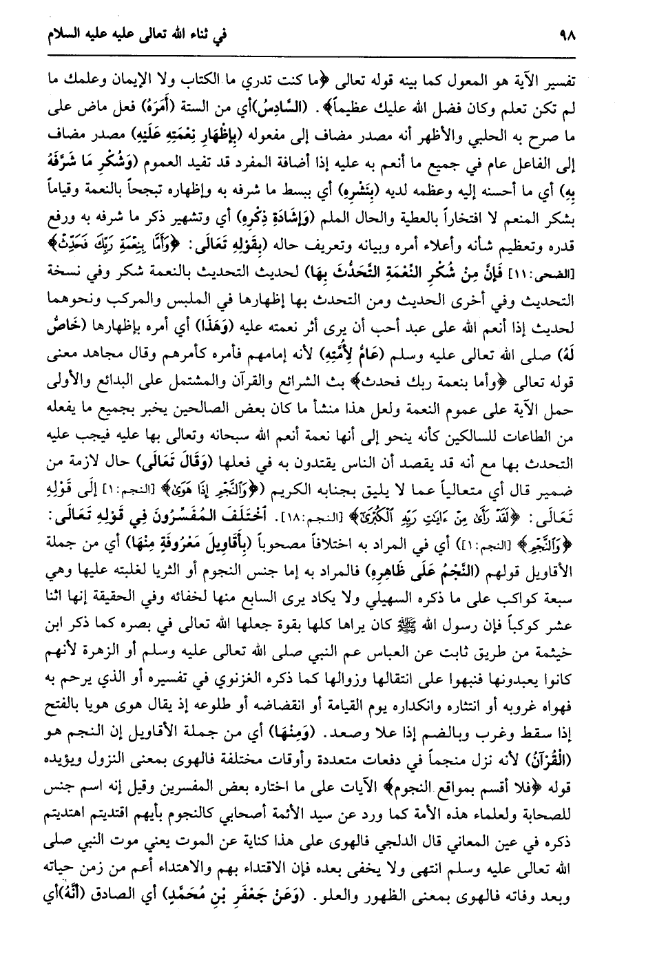 وَالنَّجْمِ [النجم: 1] ) أي في المراد به اختلافا مصحوبا (بأقاويل معروفة منها) أي من جملة الأقاويل قولهم (النّجم على ظاهره) فالمراد به إما جنس النجوم أو الثريا لغلبته عليها وهي سبعة كواكب على ما ذكره السهيلي ولا يكاد يرى السابع منها لخفائه وفي الحقيقة إنها اثنا عشر كوكبا فَإِنَّ رَسُولَ اللَّهِ صَلَّى اللَّهُ عَلَيْهِ وَسَلَّمَ كان يراها كلها بقوة جعلها الله تعالى في بصره كما ذكر ابن خيثمة من طريق ثابت عن العباس عم النبي صلى الله تعالى عليه وسلم أو الزهرة لأنهم كانوا يعبدونها فنبهوا على انتقالها وزوالها كما ذكره الغزنوي في تفسيره أو الذي يرحم به فهواه غروبه أو انتثاره وانكداره يوم القيامة أو انقضاضه أو طلوعه إذ يقال هوى هويا بالفتح إذا سقط وغرب وبالضم إذا علا وصعد. (ومنها) أي من جملة الأقاويل إن النجم هو (القرآن) لأنه نزل منجما في دفعات متعددة وأوقات مختلفة فالهوى بمعنى النزول ويؤيده قوله فَلا أُقْسِمُ بِمَواقِعِ النُّجُومِ الآيات على ما اختاره بعض المفسرين وقيل إنه اسم جنس للصحابة ولعلماء هذه الأمة كما ورد عن سيد الأئمة أصحابي كالنجوم بأيهم اقتديتم اهتديتم ذكره في عين المعاني قال الدلجي فالهوى على هذا كناية عن الموت يعني موت النبي صلى الله تعالى عليه وسلم انتهى ولا يخفى بعده فإن الاقتداء بهم والاهتداء أعم من زمن حياته وبعد وفاته فالهوى بمعنى الظهور والعلو. (وعن جعفر بن محمّد) أي الصادق (أنّه) أي