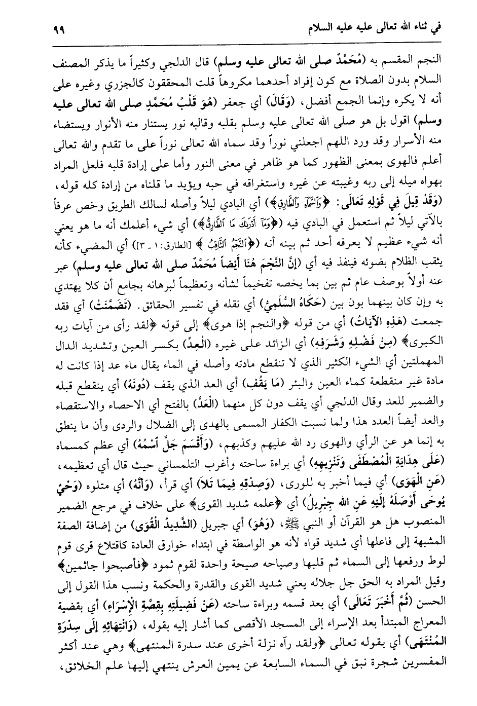 النجم المقسم به (محمّد صلى الله تعالى عليه وسلم) قال الدلجي وكثيرا ما يذكر المصنف السلام بدون الصلاة مع كون إفراد أحدهما مكروها قلت المحققون كالجزري وغيره على أنه لا يكره وإنما الجمع أفضل، (وقال) أي جعفر (هو قلب محمّد صلى الله تعالى عليه وسلم) اقول بل هو صلى الله تعالى عليه وسلم بقلبه وقالبه نور يستنار منه الأنوار ويستضاء منه الأسرار وقد ورد اللهم اجعلني نورا وقد سماه الله تعالى نورا على ما تقدم والله تعالى أعلم فالهوى بمعنى الظهور كما هو ظاهر في معنى النور وأما على إرادة قلبه فلعل المراد بهواه ميله إلى ربه وغيبته عن غيره واستغراقه في حبه ويؤيد ما قلناه من إرادة كله قوله، (وَقَدْ قِيلَ فِي قَوْلِهِ تَعَالَى: وَالسَّماءِ وَالطَّارِقِ) أي البادي ليلا وأصله لسالك الطريق وخص عرفا بالآتي ليلا ثم استعمل في البادي فيه (وَما أَدْراكَ مَا الطَّارِقُ) أي شيء أعلمك أنه ما هو يعني أنه شيء عظيم لا يعرفه أحد ثم بينه أنه (النَّجْمُ الثَّاقِبُ [الطارق: 1- 3] ) أي المضيء كأنه يثقب الظلام بضوئه فينفذ فيه أي (إِنَّ النَّجْمَ هُنَا أَيْضًا مُحَمَّدٌ صَلَّى اللَّهُ تعالى عليه وسلم) عبر عنه أولا بوصف عام ثم بين بما يخصه تفخيما لشأنه وتعظيما لبرهانه بجامع أن كلا يهتدي به وإن كان بينهما بون بين (حكاه السّلميّ) أي نقله في تفسير الحقائق. (تضمّنت) أي فقد جمعت (هذه الآيات) أي من قوله وَالنَّجْمِ إِذا هَوى إِلَى قَوْلِهِ لَقَدْ رَأى مِنْ آياتِ رَبِّهِ الْكُبْرى (من فضله وشرفه) أي الزائد على غيره (العدّ) بكسر العين وتشديد الدال المهملتين أي الشيء الكثير الذي لا تنقطع مادته وأصله في الماء يقال ماء عد إذا كانت له مادة غير منقطعة كماء العين والبئر (ما يقف) أي العد الذي يقف (دونه) أي ينقطع قبله والضمير للعد وقال الدلجي أي يقف دون كل منهما (العدّ) بالفتح أي الاحصاء والاستقصاء والعد أيضا العدد هذا ولما نسبت الكفار المسمى بالهدى إلى الضلال والردى وأن ما ينطق به إنما هو عن الرأي والهوى رد الله عليهم وكذبهم، (وأقسم جلّ اسمه) أي عظم كمسماه (على هداية المصطفى وتنزيهه) أي براءة ساحته وأغرب التلمساني حيث قال أي تعظيمه، (عن الهوى) أي فيما أخبر به للورى، (وصدقه فيما تلا) أي قرأ، (وأنّه) أي متلوه (وَحْيٌ يُوحَى أَوْصَلَهُ إِلَيْهِ عَنِ اللَّهِ جِبْرِيلُ) أي عَلَّمَهُ شَدِيدُ الْقُوى على خلاف في مرجع الضمير المنصوب هل هو القرآن أو النبي صلى الله عليه وسلّم، (وهو) أي جبريل (الشّديد القوى) من إضافة الصفة المشبهة إلى فاعلها أي شديد قواه لأنه هو الواسطة في ابتداء خوارق العادة كاقتلاع قرى قوم لوط ورفعها إلى السماء ثم قلبها وصياحه صيحة واحدة لقوم ثمود فَأَصْبَحُوا فِي دارِهِمْ جاثِمِينَ وقيل المراد به الحق جل جلاله يعني شديد القوى والقدرة والحكمة ونسب هذا القول إلى الحسن (ثمّ أخبر تعالى) أي بعد قسمه وبراءة ساحته (عن فضيلته بقصّة الإسراء) أي بقضية المعراج المبتدأ بعد الإسراء إلى المسجد الأقصى كما أشار إليه بقوله، (وانتهائه إلى سدرة المنتهى) أي بقوله تعالى وَلَقَدْ رَآهُ نَزْلَةً أُخْرى عِنْدَ سِدْرَةِ الْمُنْتَهى وهي عند أكثر المفسرين شجرة نبق في السماء السابعة عن يمين العرش ينتهي إليها علم الخلائق،