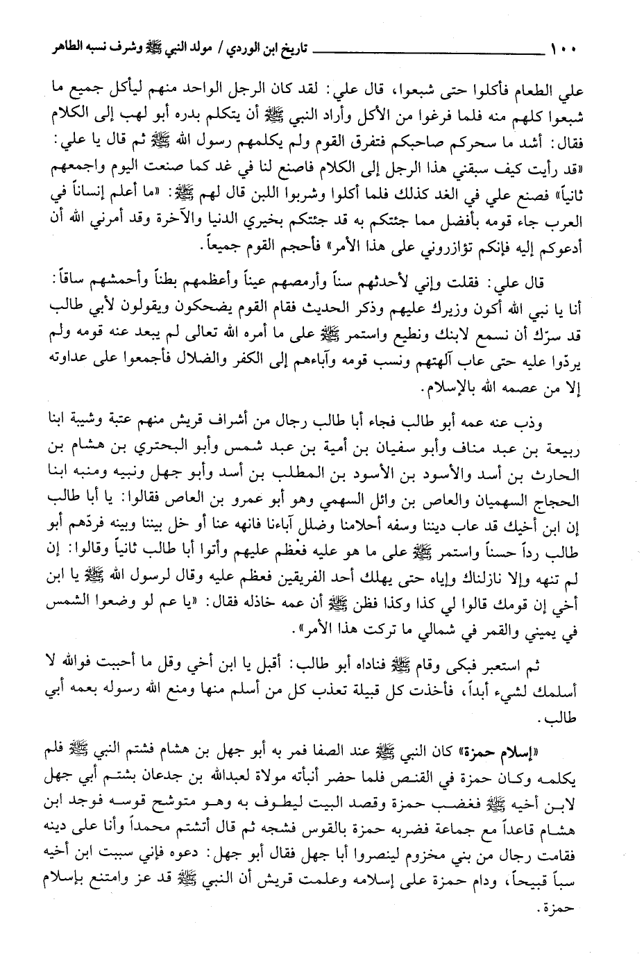 " إِسْلَام حَمْزَة " كَانَ النَّبِي - صَلَّى اللَّهُ عَلَيْهِ وَسَلَّم َ - عِنْد الصَّفَا فَمر بِهِ [إِسْنَاده صَحِيح] . أَبُو جهل بن هِشَام فشتم النَّبِي - صَلَّى اللَّهُ عَلَيْهِ وَسَلَّم َ - فَلم يكلمهُ وَكَانَ حَمْزَة فِي القنص فَلَمَّا حضر أنبأته مولاة لعبد اللَّهِ بن جدعَان بشتم أبي جهل لِابْنِ أَخِيه - صَلَّى اللَّهُ عَلَيْهِ وَسَلَّم َ - فَغَضب حَمْزَة وَقصد الْبَيْت ليطوف بِهِ وَهُوَ متوشح قوسه فَوجدَ ابْن هِشَام قَاعِدا مَعَ جمَاعَة فَضَربهُ حَمْزَة بِالْقَوْسِ فَشَجَّهُ ثمَّ قَالَ أتشتم مُحَمَّدًا وَأَنا على دينه فَقَامَتْ رجال من بني مَخْزُوم لينصروا أَبَا جهل فَقَالَ أَبُو جهل: دَعوه فَإِنِّي سببت ابْن أَخِيه سبا قبيحا، ودام حَمْزَة على إِسْلَامه وَعلمت قُرَيْش أَن النَّبِي - صَلَّى اللَّهُ عَلَيْهِ وَسَلَّم َ - قد عز وَامْتنع بِإِسْلَام حَمْزَة.