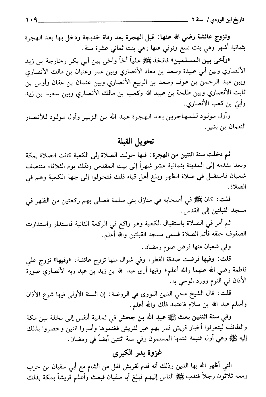 ثمَّ دخلت سنة اثْنَتَيْنِ من الْهِجْرَة: فِيهَا حولت الصَّلَاة إِلَى الْكَعْبَة كَانَت الصَّلَاة بِمَكَّة وَبعد مقدمه إِلَى الْمَدِينَة بِثمَانِيَة عشر شهرا إِلَى بَيت الْمُقَدّس وَذَلِكَ يَوْم الثُّلَاثَاء منتصف شعْبَان فَاسْتقْبل فِي صَلَاة الظّهْر وَبلغ أهل قبَاء ذَلِك فتحولوا إِلَى جِهَة الْكَعْبَة وهم فِي الصَّلَاة.