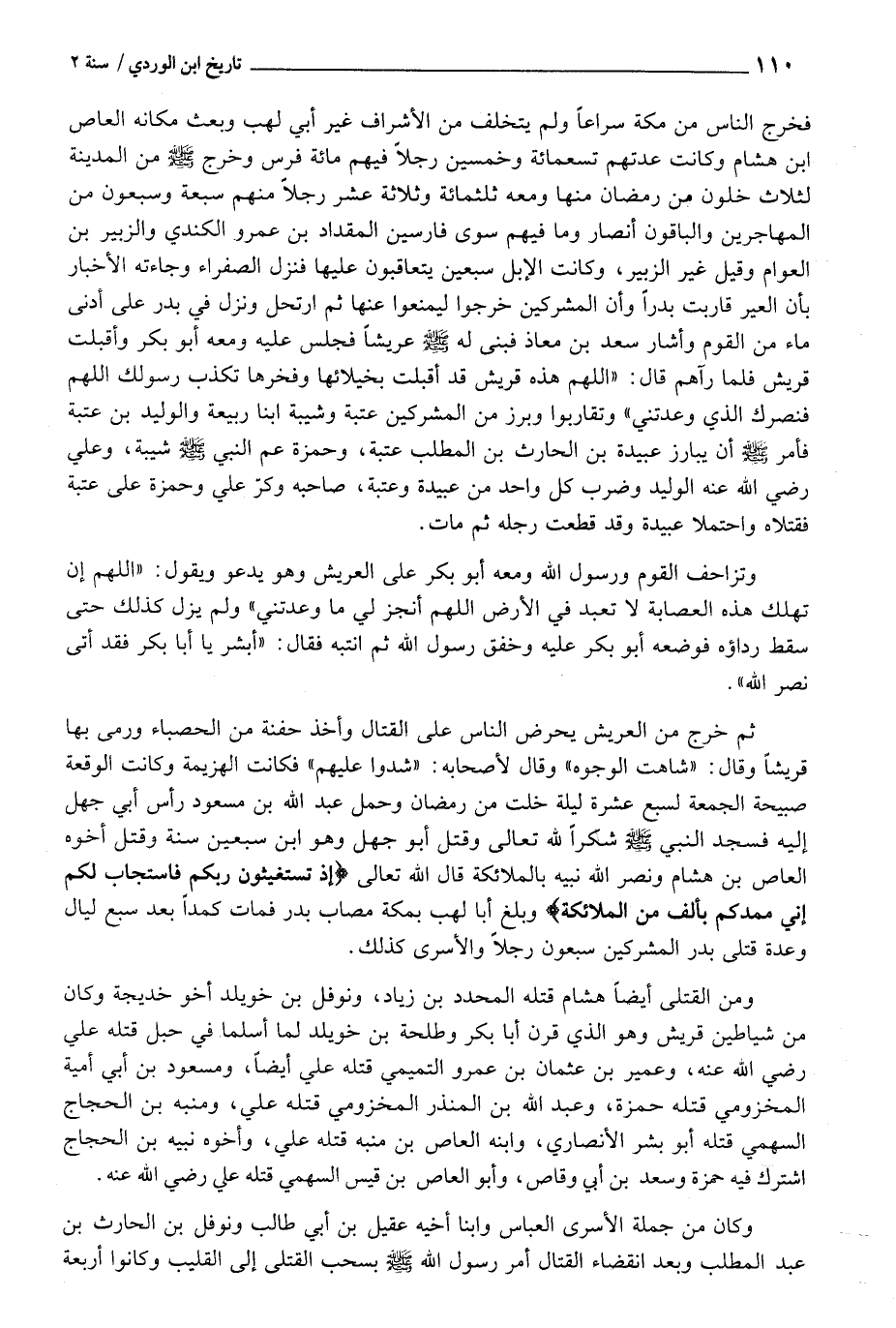 فَخرج النَّاس من مَكَّة سرَاعًا وَلم يتَخَلَّف من الْأَشْرَاف غير أبي لَهب وَبعث مَكَانَهُ الْعَاصِ ابْن هِشَام وَكَانَت عدتهمْ تِسْعمائَة وَخمسين رجلا فيهم مائَة فرس وَخرج - صَلَّى اللَّهُ عَلَيْهِ وَسَلَّم َ - من الْمَدِينَة لثلاث خلون من رَمَضَان مِنْهَا وَمَعَهُ ثلثمِائة وَثَلَاث عشر رجلا مِنْهُم سَبْعَة وَسَبْعُونَ من الْمُهَاجِرين وَالْبَاقُونَ أنصار وَمَا فيهم سوى فارسين الْمِقْدَاد بن عَمْرو الْكِنْدِيّ وَالزُّبَيْر بن الْعَوام وَقيل غير الزبير، وَكَانَت الْإِبِل سبعين يتعاقبون عَلَيْهَا فَنزل الصَّفْرَاء وجاءته الْأَخْبَار بِأَن العير قاربت بَدْرًا وَأَن الْمُشْركين خَرجُوا ليمنعوا عَنْهَا ثمَّ ارتحل وَنزل فِي بدر على ادنى مَاء من الْقَوْم وَأَشَارَ سعد بن معَاذ فَبنى لَهُ - صَلَّى اللَّهُ عَلَيْهِ وَسَلَّم َ - عَرِيشًا فَجَلَسَ عَلَيْهِ وَمَعَهُ أَبُو بكر وَأَقْبَلت قُرَيْش فَلَمَّا رَآهُمْ قَالَ: " اللَّهُمَّ هَذِه قُرَيْش قد أَقبلت بِخُيَلَائِهَا وَفَخْرهَا تكذب رَسُولك اللَّهُمَّ فَنَصرك الَّذِي وَعَدتنِي " وتقاربوا وبرز من الْمُشْركين عتبَة وَشَيْبَة ابْنا ربيعَة والوليد بن عتبَة فَأمر - صَلَّى اللَّهُ عَلَيْهِ وَسَلَّم َ - أَن يبارز عُبَيْدَة بن الْحَارِث بن الْمطلب عتبَة، وَحَمْزَة عَم النَّبِي - صَلَّى اللَّهُ عَلَيْهِ وَسَلَّم َ - شيبَة، وَعلي رَضِي اللَّهِ عَنهُ الْوَلِيد وَضرب كل وَاحِد من عُبَيْدَة وَعتبَة، صَاحبه وكر عَليّ وَحَمْزَة على عتبَة فقتلاه واحتملا عُبَيْدَة وَقد قطعت رجله ثمَّ مَاتَ.