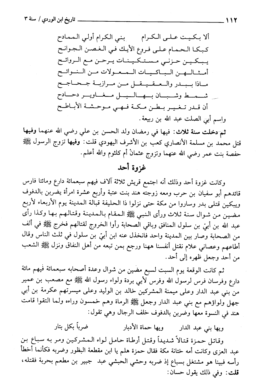 ثمَّ دخلت سنة ثَلَاث: فِيهَا فِي رَمَضَان ولد الْحسن بن عَليّ رَضِي اللَّهِ عَنْهُمَا وفيهَا قتل مُحَمَّد بن مسلمة الْأنْصَارِيّ كَعْب بن الْأَشْرَف الْيَهُودِيّ قلت: وفيهَا تزوج الرَّسُول - صَلَّى اللَّهُ عَلَيْهِ وَسَلَّم َ - حَفْصَة بنت عمر رَضِي الله عَنْهُمَا وَتزَوج عُثْمَان أم كُلْثُوم وَالله أعلم.