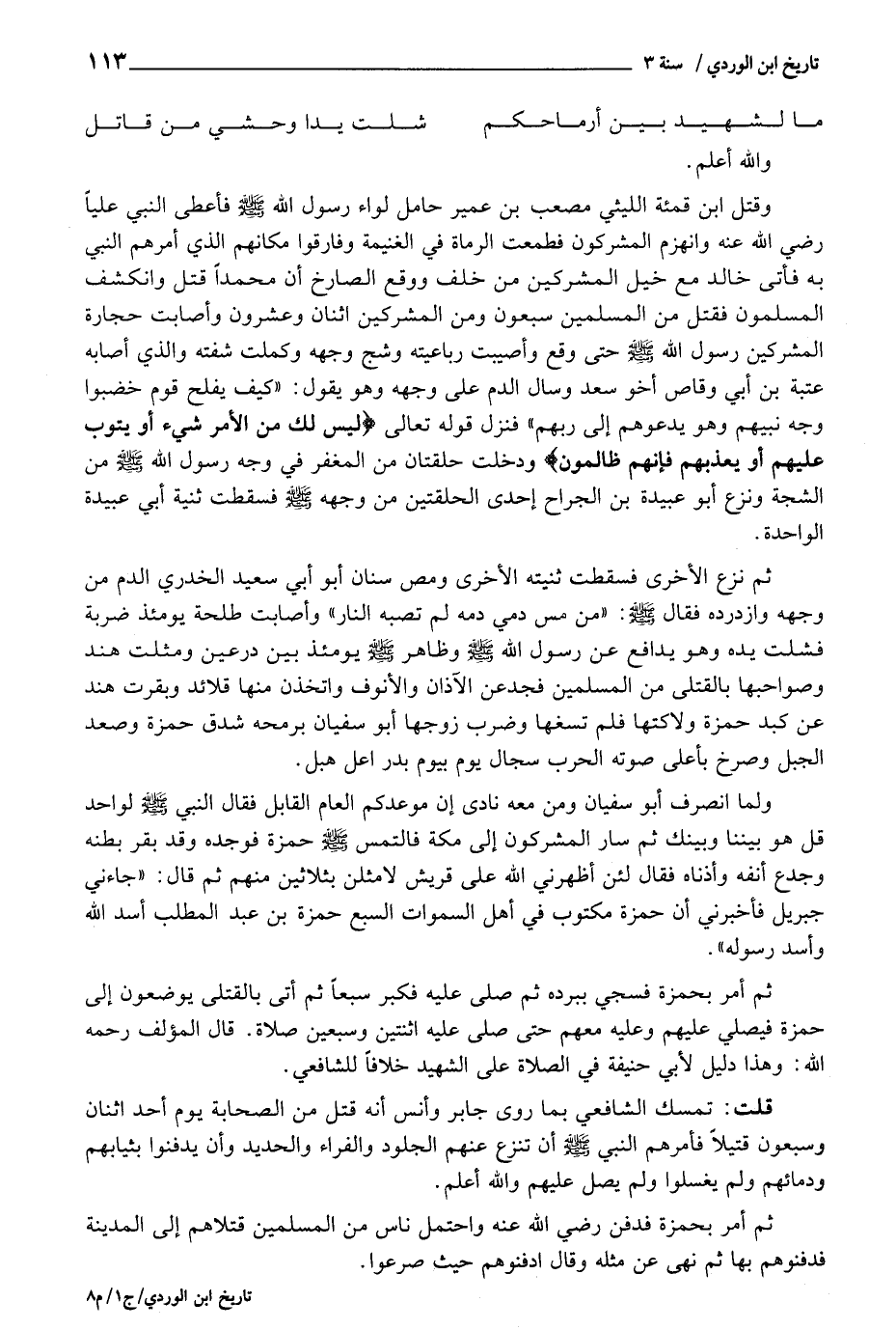 ثمَّ أَمر بِحَمْزَة فسجي بِبرْدِهِ ثمَّ صلى عَلَيْهِ فَكبر سبعا ثمَّ أَتَى بالقتلى يوضعون إِلَى حَمْزَة فَيصَلي عَلَيْهِم وَعَلِيهِ مَعَهم حَتَّى صلى عَلَيْهِ اثْنَتَيْنِ وَسبعين صَلَاة. قَالَ الْمُؤلف رَحمَه اللَّهِ: وَهَذَا دَلِيل لأبي حنيفَة فِي الصَّلَاة على الشَّهِيد خلافًا للشَّافِعِيّ