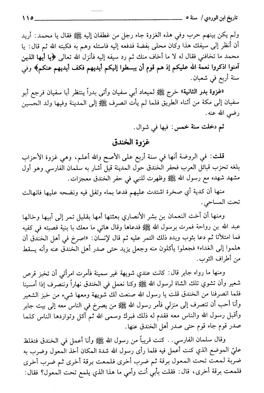 قلت: فِي الرَّوْضَة أَنَّهَا فِي سنة أَربع على الْأَصَح وَالله أعلم، وَهِي غَزْوَة الْأَحْزَاب بلغَة تحزب قبائل الْعَرَب فحفر الخَنْدَق حول الْمَدِينَة قيل أَشَارَ بِهِ سلمَان الْفَارِسِي وَهُوَ أول مشْهد شهده مَعَ رَسُول اللَّهِ - صَلَّى اللَّهُ عَلَيْهِ وَسَلَّم َ - وَظَهَرت للنَّبِي فِي حفر الخَنْدَق معجزات.