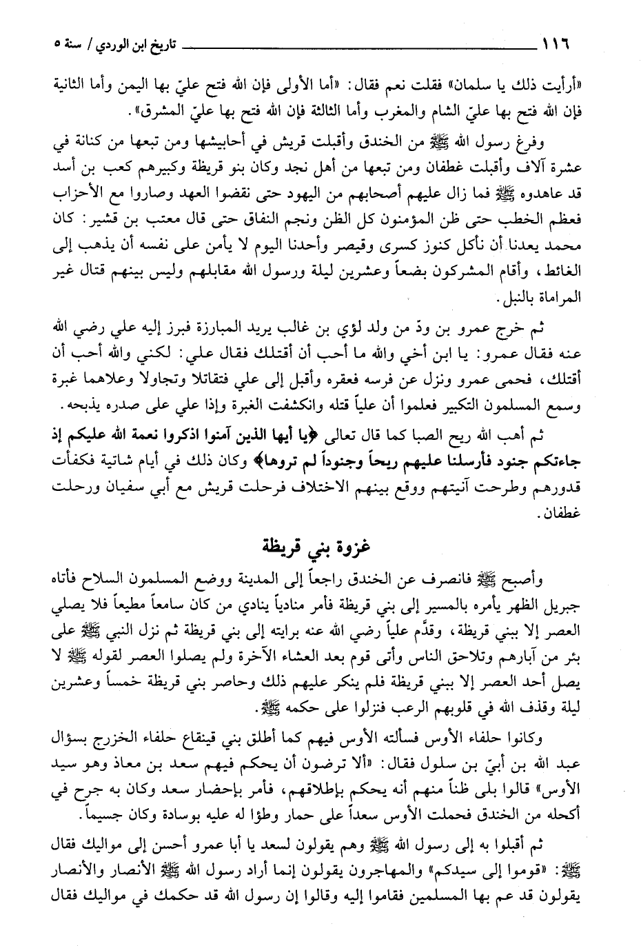 وَأصْبح - صَلَّى اللَّهُ عَلَيْهِ وَسَلَّم َ - فَانْصَرف عَن الخَنْدَق رَاجعا إِلَى الْمَدِينَة وَوضع الْمُسلمُونَ السِّلَاح فَأَتَاهُ جِبْرِيل الظّهْر يَأْمُرهُ بِالْمَسِيرِ إِلَى بني قُرَيْظَة فَأمر مناديا يُنَادي من كَانَ سَامِعًا مُطيعًا فَلَا يُصَلِّي الْعَصْر إِلَّا ببني قُرَيْظَة، وَقدم عليا رَضِي اللَّهِ عَنهُ برايته إِلَى بني قُرَيْظَة ثمَّ نزل النَّبِي - صَلَّى اللَّهُ عَلَيْهِ وَسَلَّم َ - على بِئْر من أبارهم وتلاحق النَّاس وأتى قوم بعد الْعشَاء الْآخِرَة وَلم يصلوا الْعَصْر لقَوْله - صَلَّى اللَّهُ عَلَيْهِ وَسَلَّم َ - لَا يصل أحد الْعَصْر إِلَّا ببني قُرَيْظَة فَلم يُنكر عَلَيْهِم ذَلِك وحاصر بني قُرَيْظَة خمْسا وَعشْرين لَيْلَة وَقذف اللَّهِ فِي قُلُوبهم الرعب فنزلوا على حكمه - صَلَّى اللَّهُ عَلَيْهِ وَسَلَّم َ -.