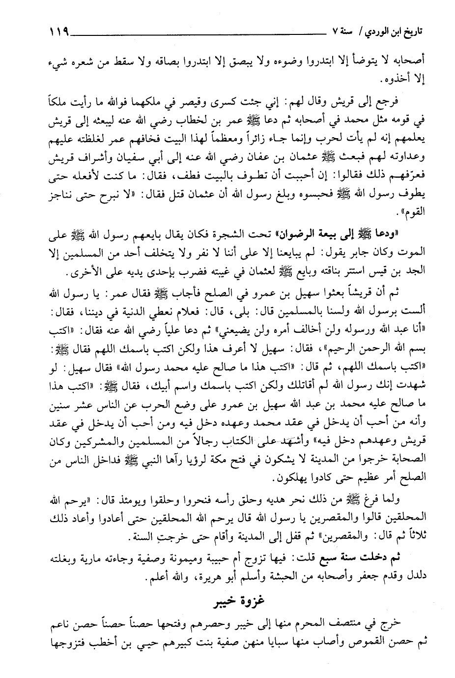 ثمَّ أَن قُريْشًا بعثوا سُهَيْل بن عَمْرو فِي الصُّلْح فَأجَاب - صَلَّى اللَّهُ عَلَيْهِ وَسَلَّم َ - فَقَالَ عمر: يَا رَسُول الله أَلَسْت برَسُول اللَّهِ ولسنا بِالْمُسْلِمين قَالَ: بلَى، قَالَ: فعلام نعطي الدنية فِي ديننَا، فَقَالَ: " أَنا عبد اللَّهِ وَرَسُوله وَلنْ أُخَالِف أمره وَلنْ يضيعني " ثمَّ دَعَا عليا رَضِي اللَّهِ عَنهُ فَقَالَ: " أكتب بِسم اللله الرَّحْمَن الرَّحِيم: فَقَالَ: سُهَيْل لَا أعرف هَذَا وَلَكِن اكْتُبْ بِاسْمِك اللَّهُمَّ فَقَالَ - صَلَّى اللَّهُ عَلَيْهِ وَسَلَّم َ -: " اكْتُبْ بِاسْمِك اللَّهُمَّ، ثمَّ قَالَ: " اكْتُبْ هَذَا مَا صَالح عَلَيْهِ مُحَمَّد رَسُول اللَّهِ " فَقَالَ سُهَيْل: لَو شهِدت إِنَّك رَسُول اللَّهِ لم أقاتلك وَلَكِن اكْتُبْ بِاسْمِك وَاسم أَبِيك، فَقَالَ: - صَلَّى اللَّهُ عَلَيْهِ وَسَلَّم َ -: " اكْتُبْ هَذَا مَا صَالح عَلَيْهِ مُحَمَّد بن عبد اللَّهِ سُهَيْل بن عَمْرو على وضع الْحَرْب عَن النَّاس عشر سِنِين وَأَنه من احب أَن يدْخل فِي عقد مُحَمَّد وَعَهده دخل فِيهِ وَمن احب أَن يدْخل فِي عقد قُرَيْش وَعَهْدهمْ دخل فِيهِ " وَأشْهد على الْكتاب رجَالًا من الْمُسلمين وَالْمُشْرِكين وَكَانَ الصَّحَابَة خَرجُوا من الْمَدِينَة لَا يَشكونَ فِي فتح مَكَّة لرؤيا رَآهَا النَّبِي - صَلَّى اللَّهُ عَلَيْهِ وَسَلَّم َ - فداخل النَّاس من الصُّلْح أَمر عَظِيم حَتَّى كَادُوا يهْلكُونَ.