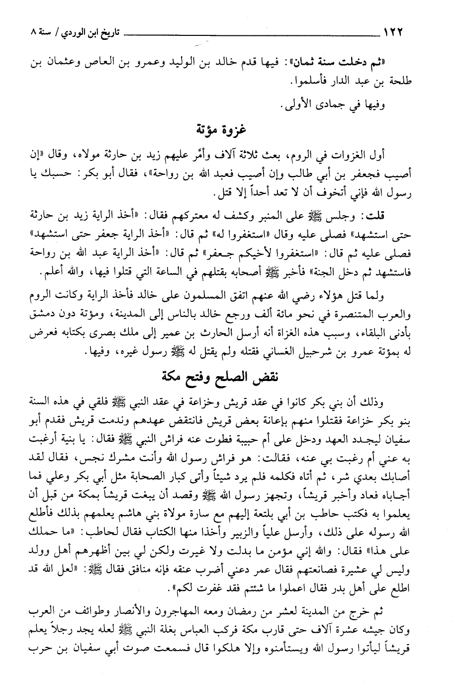 " ثمَّ دخلت سنة ثَمَان ": فِيهَا قدم خَالِد بن الْوَلِيد وَعَمْرو بن الْعَاصِ وَعُثْمَان بن طَلْحَة بن عبد الدَّار فأسلموا. وفيهَا فِي جمادي الأولى.