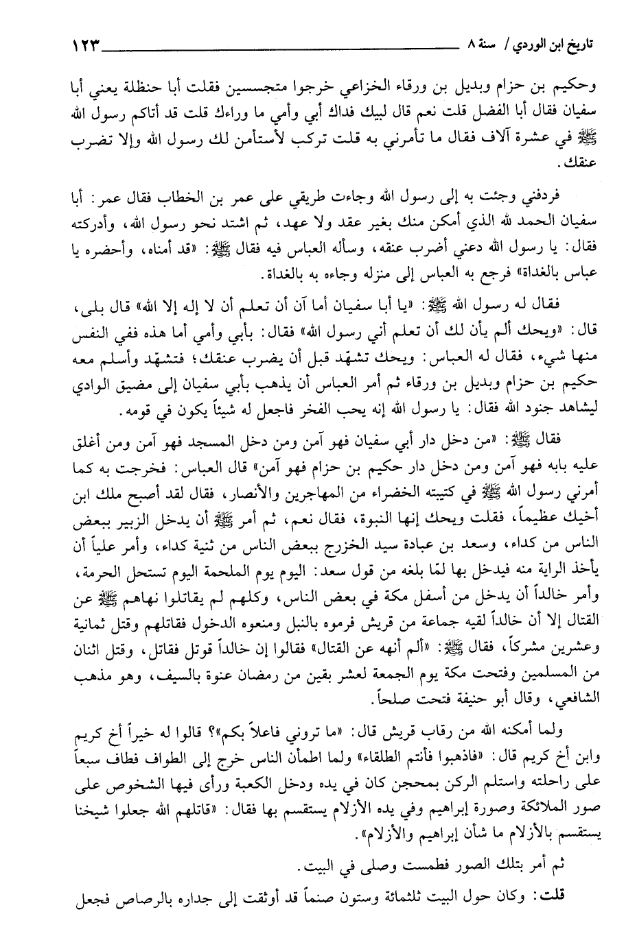 وَحَكِيم بن حزَام وَبُدَيْل بن وَرْقَاء الْخُزَاعِيّ خَرجُوا متجسسين فَقلت أَبَا حَنْظَلَة يَعْنِي أَبَا سُفْيَان فَقَالَ أَبَا الْفضل قلت: نعم قَالَ لبيْك فدَاك أبي وَأمي مَا وَرَاءَك قلت قد أَتَاكُم رَسُول اللَّهِ - صَلَّى اللَّهُ عَلَيْهِ وَسَلَّم َ - فِي عشرَة آلَاف فَقَالَ مَا تَأْمُرنِي بِهِ قلت تركب لأستأمن لَك رَسُول اللَّهِ وَإِلَّا تضرب عُنُقك.