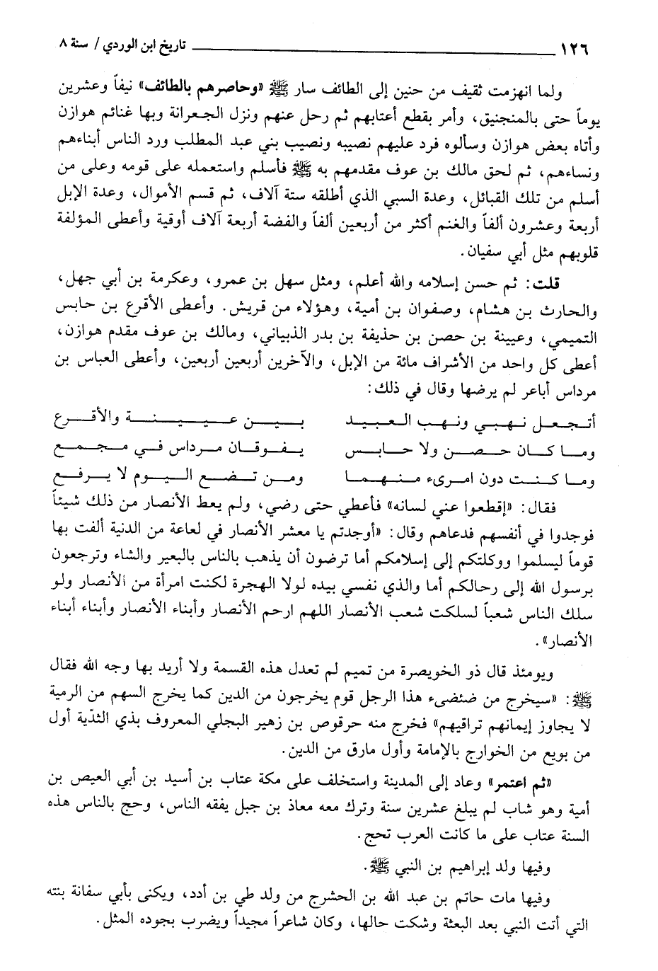 قلت: ثمَّ حسن إِسْلَامه وَالله أعلم، وَمثل سهل بن عَمْرو، وَعِكْرِمَة بن أبي جهل والْحَارث بن هِشَام، صَفْوَان بن أُميَّة، وَهَؤُلَاء من قُرَيْش. وَأعْطى الْأَقْرَع بن حَابِس التَّمِيمِي، وعيينة بن حصن بن حُذَيْفَة بن بدر الذبياني، وَمَالك بن عَوْف مقدم هوَازن، أعْطى كل وَاحِد من الْأَشْرَاف مائَة من الْإِبِل، والآخرين أَرْبَعِينَ أَرْبَعِينَ، وَأعْطى الْعَبَّاس بن مرداس أباعر لم يرضها وَقَالَ فِي ذَلِك: