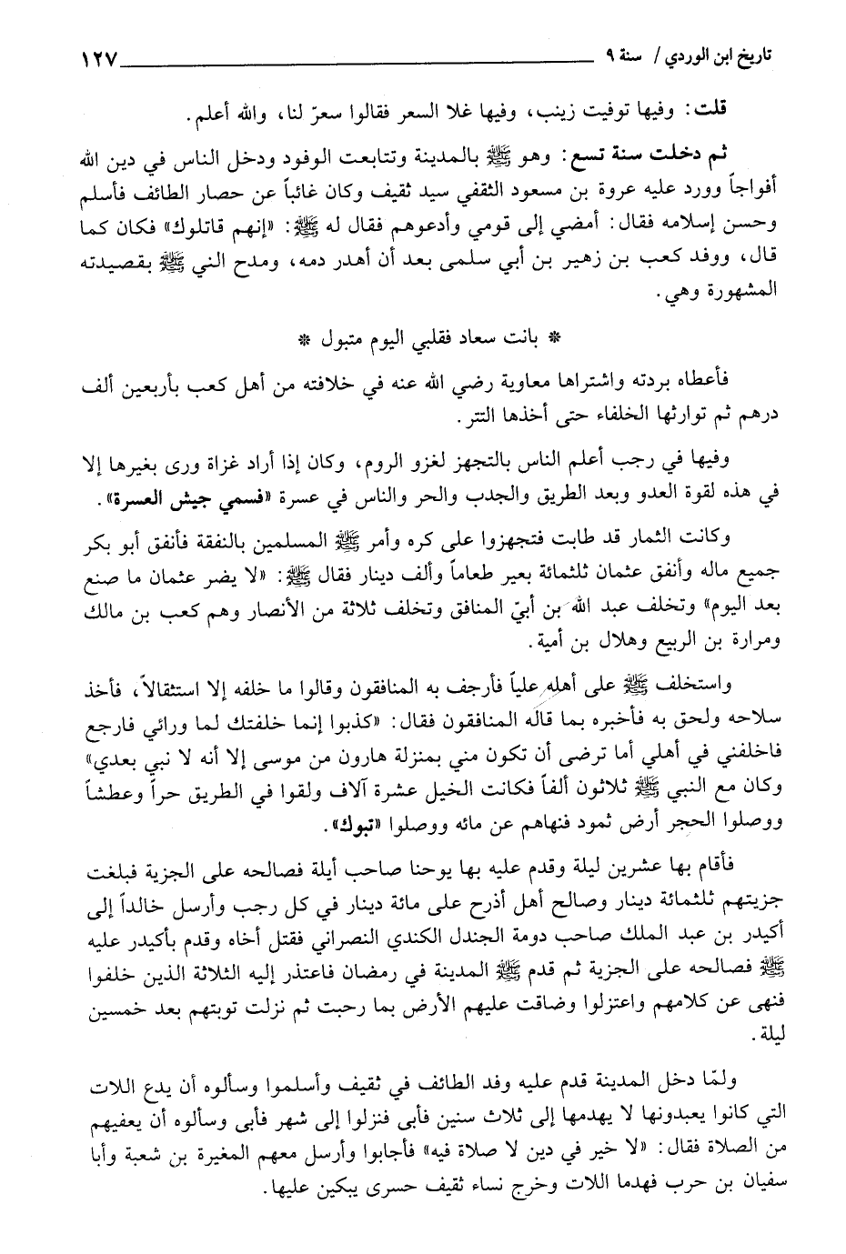 ثمَّ دخلت سنة تسع: وَهُوَ - صَلَّى اللَّهُ عَلَيْهِ وَسَلَّم َ - بِالْمَدِينَةِ وَتَتَابَعَتْ الْوُفُود وَدخل النَّاس فِي دين اللَّهِ أَفْوَاجًا وَورد عَلَيْهِ عُرْوَة بن مَسْعُود الثَّقَفِيّ سيد ثَقِيف وَكَانَ غَائِبا عَن حِصَار الطَّائِف فَأسلم وَحسن إِسْلَامه فَقَالَ: أمضي إِلَى قومِي وأدعوهم فَقَالَ لَهُ - صَلَّى اللَّهُ عَلَيْهِ وَسَلَّم َ -: " إِنَّهُم قاتلوك " فَكَانَ كَمَا قَالَ، ووفد كَعْب بن زُهَيْر بن أبي سلمى بعد ان أهْدر دَمه، ومدح النَّبِي - صَلَّى اللَّهُ عَلَيْهِ وَسَلَّم َ - بقصيدته الْمَشْهُورَة وَهِي.