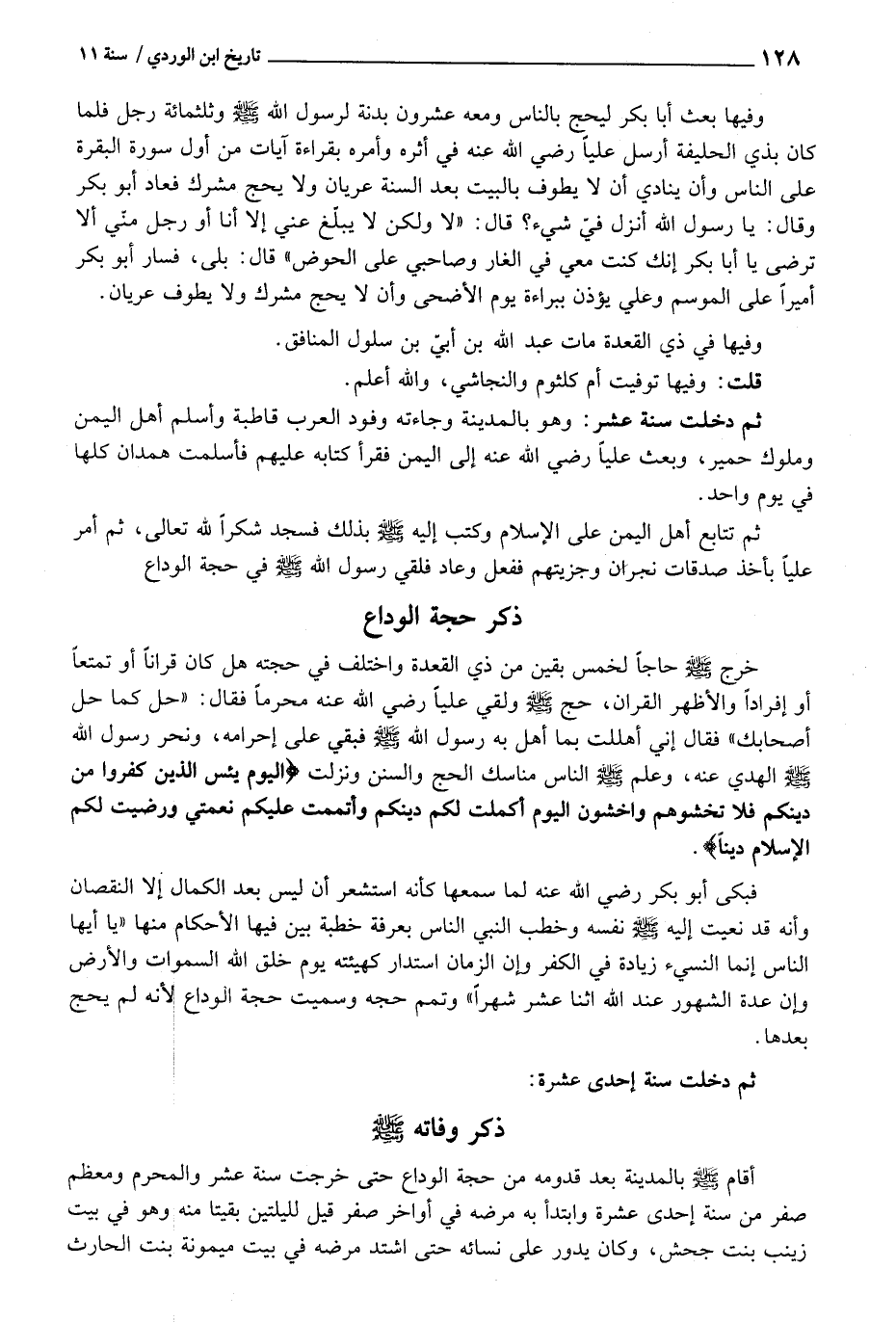 فَبكى أَبُو بكر رَضِي اللَّهِ عَنهُ لما سَمعهَا كَأَنَّهُ استشعر أَن لَيْسَ بعد الْكَمَال إِلَّا النُّقْصَان وَأَنه قد نعيت إِلَيْهِ - صَلَّى اللَّهُ عَلَيْهِ وَسَلَّم َ - نَفسه وخطب النَّبِي النَّاس بِعَرَفَة خطْبَة بَين فِيهَا الْأَحْكَام مِنْهَا " يَا أَيهَا النَّاس إِنَّمَا النسيء زِيَادَة فِي الْكفْر وَإِن الزَّمَان اسْتَدَارَ كَهَيئَةِ يَوْم خلق اللَّهِ السَّمَوَات وَالْأَرْض وَإِن عدَّة الشُّهُور عِنْد اللَّهِ اثْنَا عشر شهرا " وتمم حجه وَسميت حجَّة الْوَدَاع لِأَنَّهُ لم يحجّ بعْدهَا.