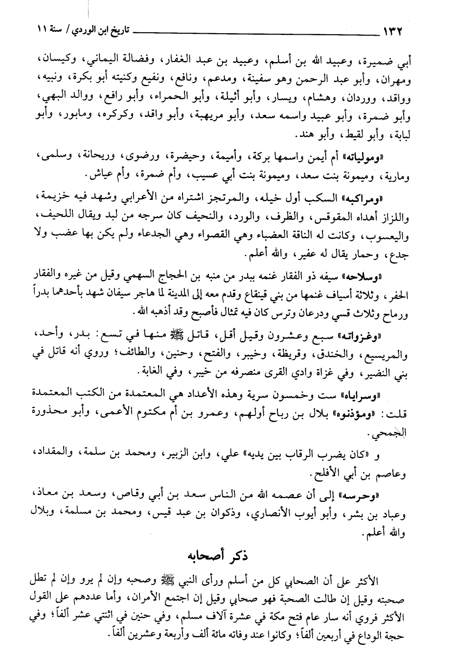 " وسراياه " سِتّ وَخَمْسُونَ سَرِيَّة وَهَذِه الْأَعْدَاد هِيَ الْمُعْتَمدَة من الْكتب الْمُعْتَمدَة قلت: " ومؤذنوه " بِلَال بن رَبَاح أَوَّلهمْ، وَعَمْرو بن أم مَكْتُوم الْأَعْمَى، وَأَبُو مَحْذُورَة الجُمَحِي.