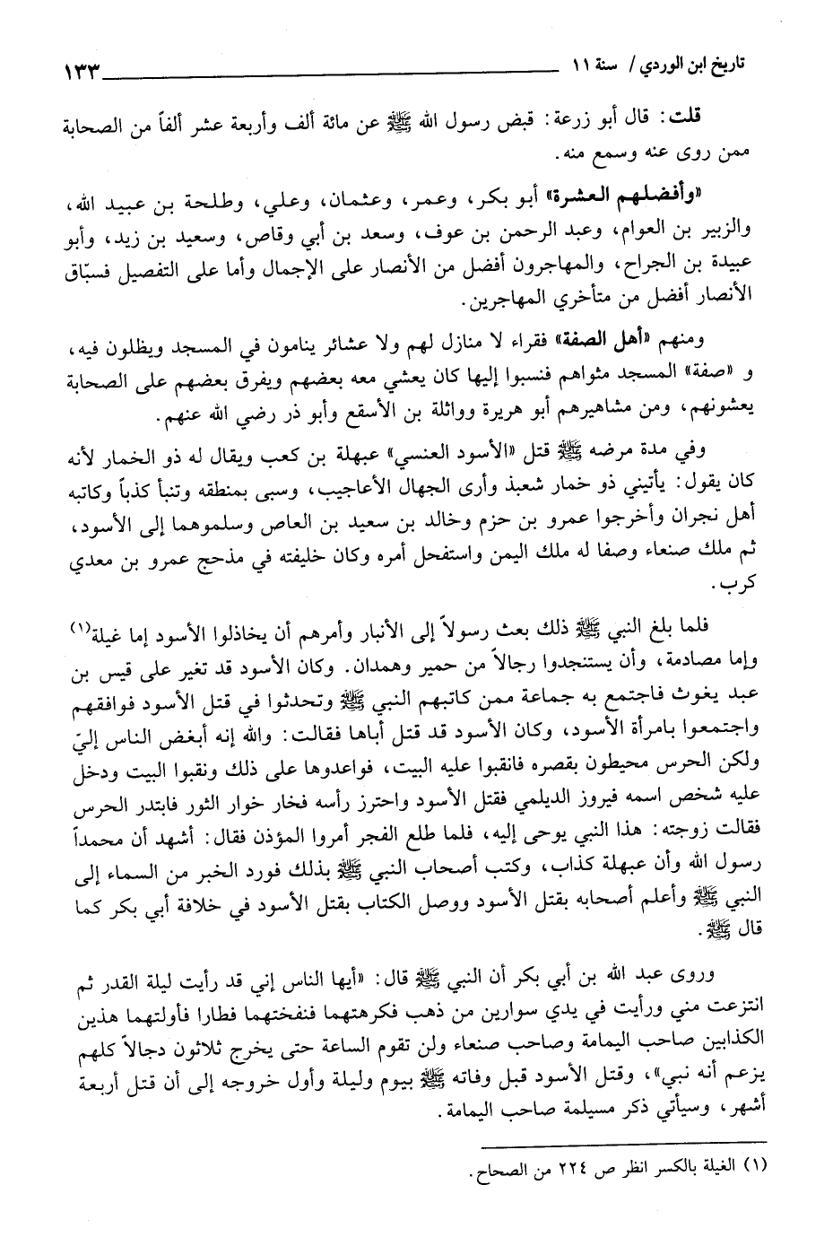 وَفِي مُدَّة مَرضه - صَلَّى اللَّهُ عَلَيْهِ وَسَلَّم َ - قتل " الْأسود الْعَنسِي " عبهلة بن كَعْب وَيُقَال لَهُ ذُو الْخمار لِأَنَّهُ كَانَ يَقُول: يأتيني ذُو خمار شعبذ وَأرى الْجُهَّال الْأَعَاجِيب، وسبى بمنطقة وتنبأ كذبا وكاتبه أهل نَجْرَان وأخرجوا عَمْرو بن حزم وخَالِد بن سعيد بن الْعَاصِ وسلموهما إِلَى الْأسود، ثمَّ ملك صنعاء وَصفا لَهُ ملك الْيمن واستفحل أمره وَكَانَ خَلِيفَته فِي مذْحج عَمْرو بن معدي كرب.