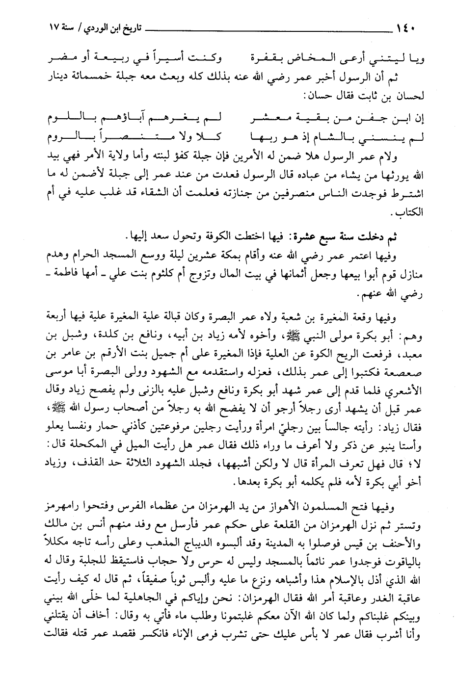 وفيهَا فتح الْمُسلمُونَ الأهواز من يَد الهرمزان من عُظَمَاء الْفرس وفتحوا رامهرمز وتستر ثمَّ نزل الهرمزان من القلعة على حكم عمر فَأرْسل مَعَ وَفد مِنْهُم أنس بن مَالك والأحنف بن قيس فوصلوا بِهِ الْمَدِينَة وَقد ألبسوه الديباج الْمَذْهَب وعَلى رَأسه تاجه مكللا بالياقوت فوجدوا عمر نَائِما بِالْمَسْجِدِ وَلَيْسَ لَهُ حرس وَلَا حجاب فَاسْتَيْقَظَ للجبلة وَقَالَ لَهُ اللَّهِ الَّذِي أذلّ بِالْإِسْلَامِ هَذَا وأشباهه وَنزع مَا عَلَيْهِ وألبس ثوبا صفيفا، ثمَّ قَالَ لَهُ كَيفَ رَأَيْت عَاقِبَة الْغدر وعاقبة أَمر اللَّهِ فَقَالَ الهرمزان: نَحن وَإِيَّاكُم فِي الْجَاهِلِيَّة لما خلى اللَّهِ بيني وَبَيْنكُم غلبناكم وَلما كَانَ اللَّهِ الْآن مَعكُمْ غلبتمونا وَطلب مَاء فَأتي بِهِ وَقَالَ: أَخَاف أَن يقتلني وَأَنا أشْرب فَقَالَ عمر لَا بَأْس عَلَيْك حَتَّى تشرب فَرمى الْإِنَاء فانكسر فقصد عمر قَتله فَقَالَت