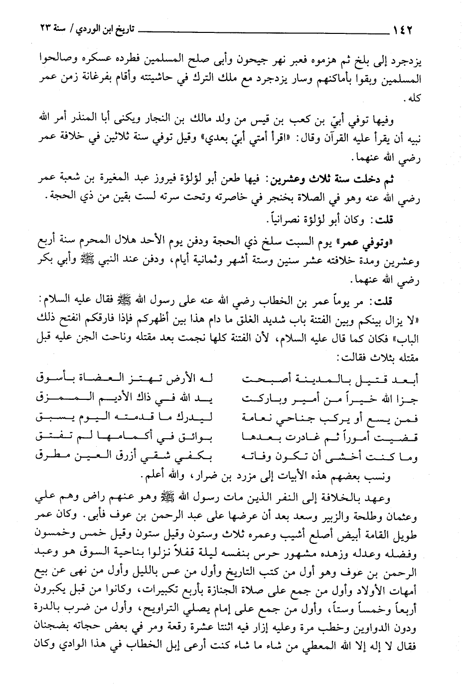 " وَتُوفِّي عمر " يَوْم السبت سلخ ذِي الْحجَّة وَدفن يَوْم الْأَحَد هِلَال الْمحرم سنة أَربع وَعشْرين وَمُدَّة خِلَافَته عشر سِنِين وَسِتَّة أشهر وَثَمَانِية أَيَّام، وَدفن عِنْد النَّبِي - صَلَّى اللَّهُ عَلَيْهِ وَسَلَّم َ - وَأبي بكر رَضِي اللَّهِ عَنْهُمَا.