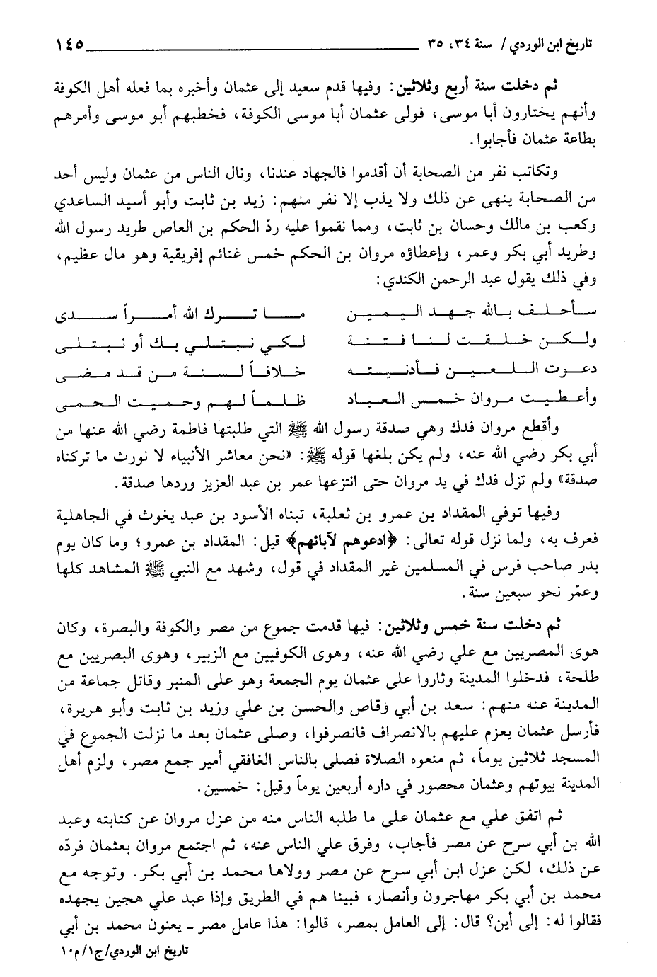 ثمَّ دخلت سنة خمس وَثَلَاثِينَ: فِيهَا قدمت جموع من مصر والكوفة وَالْبَصْرَة، وَكَانَ هوى المصريين مَعَ عَليّ رَضِي اللَّهِ عَنهُ، وَهوى الْكُوفِيّين مَعَ الزبير، وَهُوَ الْبَصرِيين مَعَ طَلْحَة، فَدَخَلُوا الْمَدِينَة وثاروا على عُثْمَان يَوْم الْجُمُعَة وَهُوَ على الْمِنْبَر وَقَاتل جمَاعَة من الْمَدِينَة عَنهُ مِنْهُم: سعد بن أبي وَقاص وَالْحسن بن عَليّ وَزيد بن ثَابت وَأَبُو هُرَيْرَة، فَأرْسل عُثْمَان يعزم عَلَيْهِم بالانصراف فانصرفوا، وَصلى عُثْمَان بعد مَا نزلت الجموع فِي الْمَسْجِد ثَلَاثِينَ يَوْمًا، ثمَّ منعُوهُ الصَّلَاة فصلى بِالنَّاسِ الغافقي أَمِير جمع مصر، وَلزِمَ أهل الْمَدِينَة بُيُوتهم وَعُثْمَان مَحْصُور فِي دَاره أَرْبَعِينَ يَوْمًا وَقيل: خمسين.