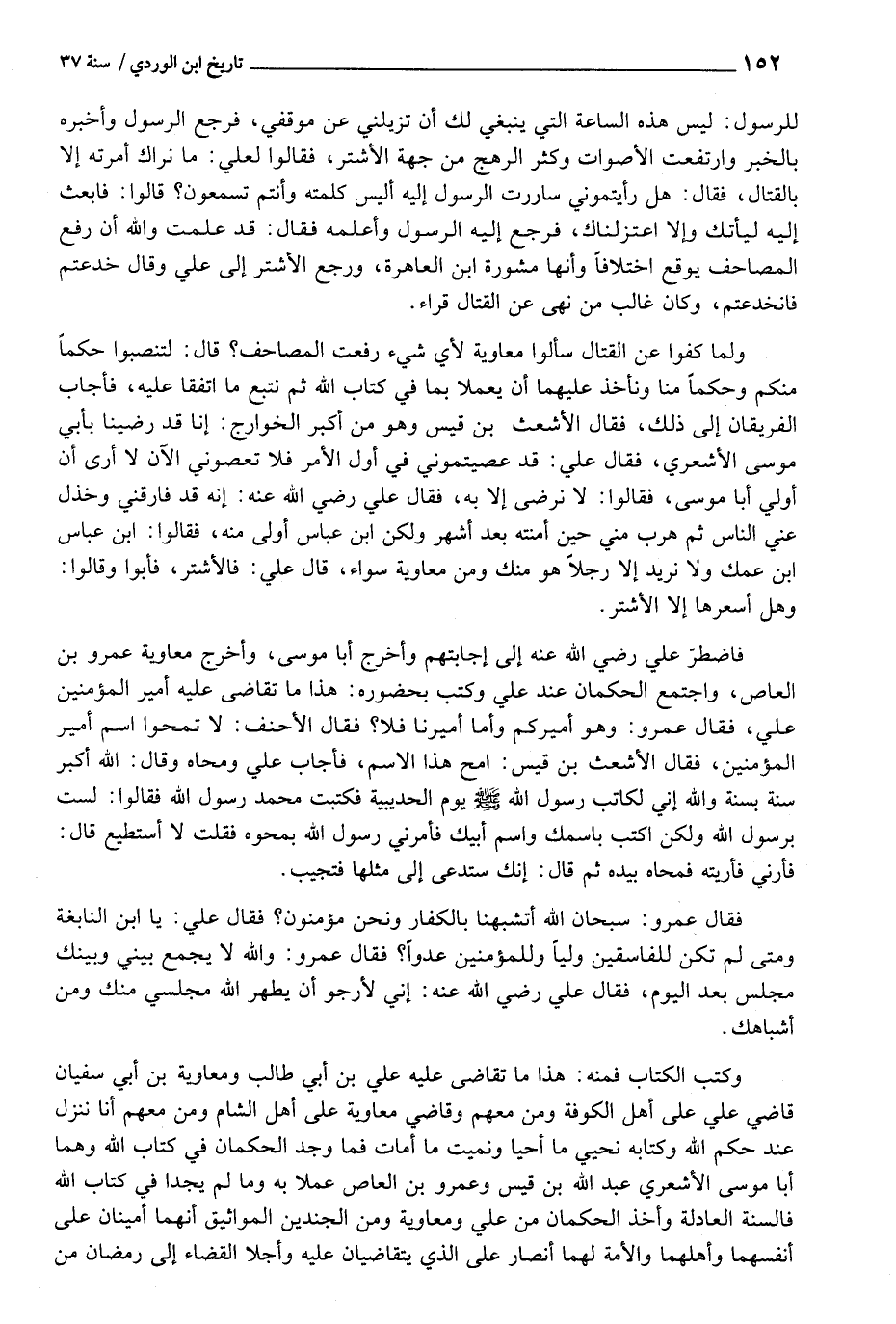 وَلما كفوا عَن الْقِتَال سَأَلُوا مُعَاوِيَة لأي شَيْء رفعت الْمَصَاحِف؟ قَالَ: لتنصبوا حكما مِنْكُم وَحكما منا ونأخذ عَلَيْهِمَا أَن يعملا بِمَا فِي كتاب اللَّهِ ثمَّ نتبع مَا اتفقَا عَلَيْهِ، فَأجَاب الْفَرِيقَانِ إِلَى ذَلِك؛ فَقَالَ الْأَشْعَث بن قيس وَهُوَ من أكبر الْخَوَارِج: إِنَّا قد رَضِينَا بِأبي مُوسَى الْأَشْعَرِيّ، فَقَالَ عَليّ: قد عصيتموني فِي أول الْأَمر فَلَا تعصوني الْآن لَا أرى أَن أولي أَبَا مُوسَى، فَقَالُوا: لَا نرضى إِلَّا بِهِ، فَقَالَ عَليّ رَضِي اللَّهِ عَنهُ: إِنَّه قد فارقني وخذل عني النَّاس ثمَّ هرب مني حِين أمنته بعد أشهر وَلَكِن ابْن عَبَّاس أولى مِنْهُ، فَقَالُوا: ابْن عَبَّاس ابْن عَمَلك وَلَا نُرِيد إِلَّا رجلا هُوَ مِنْك وَمن مُعَاوِيَة سَوَاء، قَالَ عَليّ: فالأشتر، فَأَبَوا وَقَالُوا: وَهل أسعرها إِلَّا الأشتر.