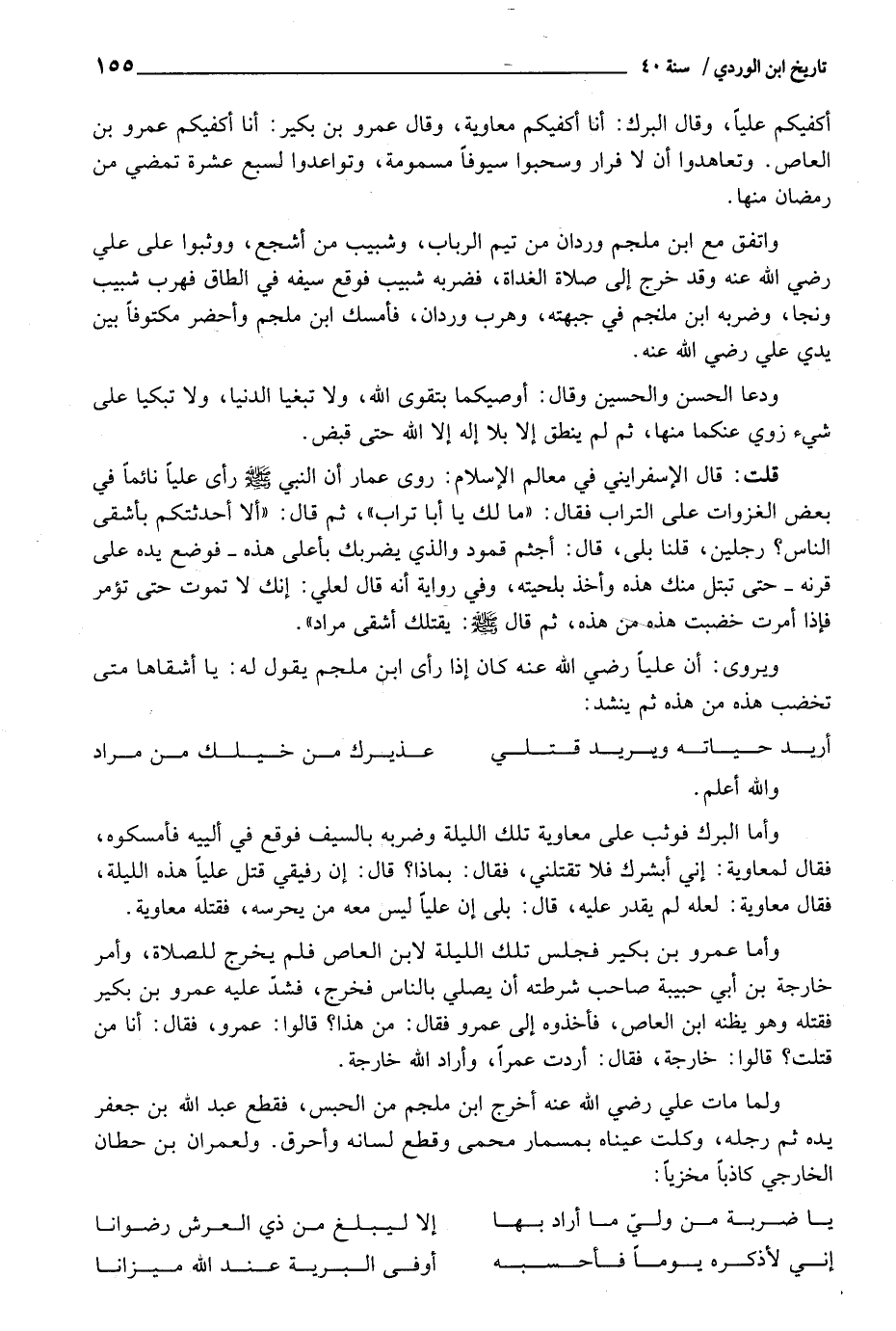 ويروى: أَن عليا رَضِي اللَّهِ عَنهُ كَانَ إِذا رأى ابْن ملجم يَقُول لَهُ: يَا أشقاها مَتى تخضب هَذِه من هَذِه ثمَّ ينشد: