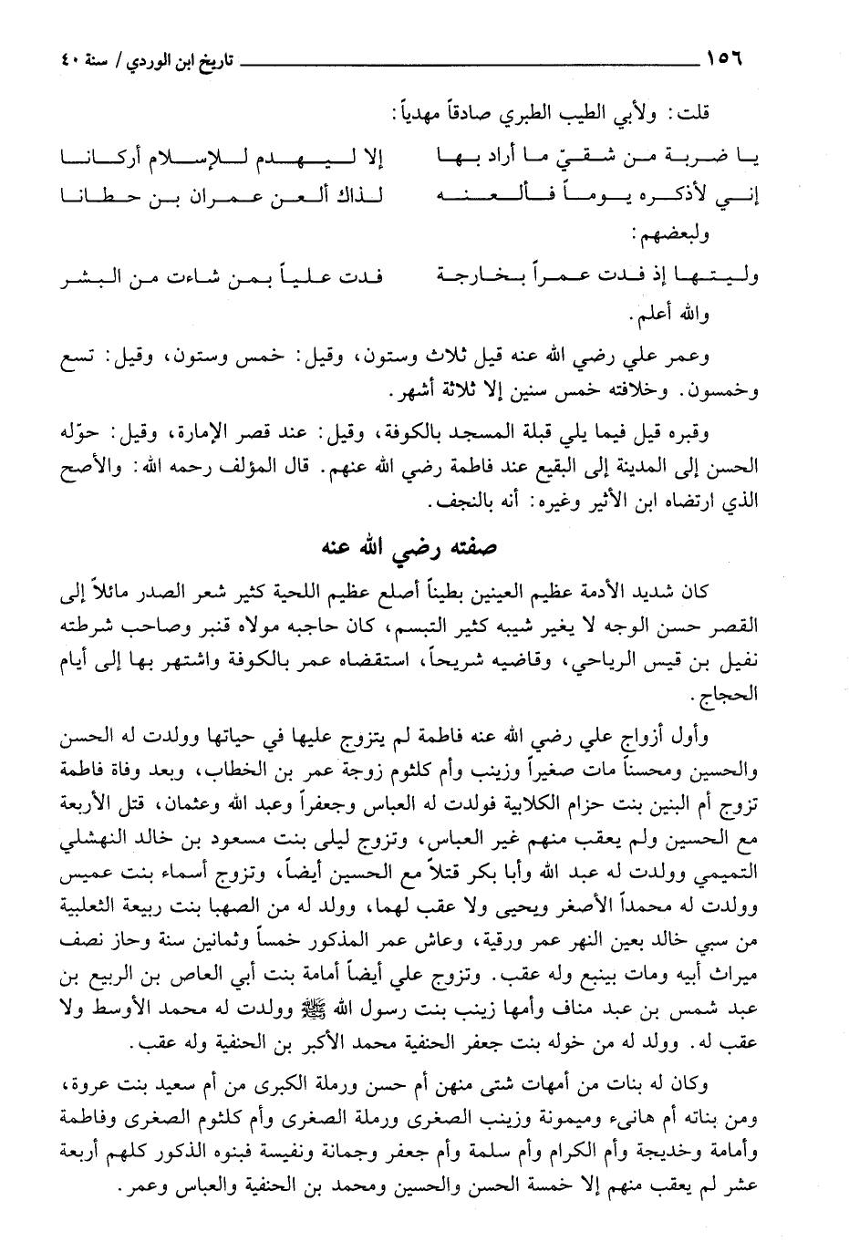 وَأول أَزوَاج عَليّ رَضِي اللَّهِ عَنهُ فَاطِمَة لم يتَزَوَّج عَلَيْهَا فِي حَيَاتهَا وَولدت لَهُ الْحسن وَالْحُسَيْن ومحسنا مَاتَ صَغِيرا وَزَيْنَب وَأم كُلْثُوم زَوْجَة عمر بن الْخطاب، وَبعد وَفَاة فَاطِمَة تزوج أم الْبَنِينَ بنت حزَام الْكلابِيَّة فَولدت لَهُ الْعَبَّاس وجعفرا وَعبد اللَّهِ وَعُثْمَان، قتل الْأَرْبَعَة مَعَ الْحُسَيْن وَلم يعقب مِنْهُم غير الْعَبَّاس، وَتزَوج ليلى بنت مَسْعُود بن خَالِد النَّهْشَلِي التَّمِيمِي وَولدت لَهُ عبد اللَّهِ وَأَبا بكر قتلا مَعَ الْحُسَيْن أَيْضا، وَتزَوج أَسمَاء بنت عُمَيْس وَولدت لَهُ مُحَمَّدًا الْأَصْغَر وَيحيى وَلَا عقب لَهما، وَولد لَهُ من الصهبا بنت ربيعَة الثعلبية من سبي خَالِد بِعَين النَّهر عمر ورقية، وعاش عمر الْمَذْكُور خمْسا وَثَمَانِينَ سنة وَحَازَ نصف مِيرَاث أَبِيه وَمَات بينبع وَله عقب. وَتزَوج عَليّ أَيْضًا أُمَامَة بنت أبي الْعَاصِ بن الرّبيع بن عبد شمس بن عبد منَاف وَأمّهَا زَيْنَب بنت رَسُول اللَّهِ - صَلَّى اللَّهُ عَلَيْهِ وَسَلَّم َ - وَولدت لَهُ مُحَمَّد الْأَوْسَط وَلَا عقب لَهُ. وَولد لَهُ من خوله بنت جَعْفَر الْحَنَفِيَّة مُحَمَّد الْأَكْبَر بن الْحَنَفِيَّة وَله عقب.