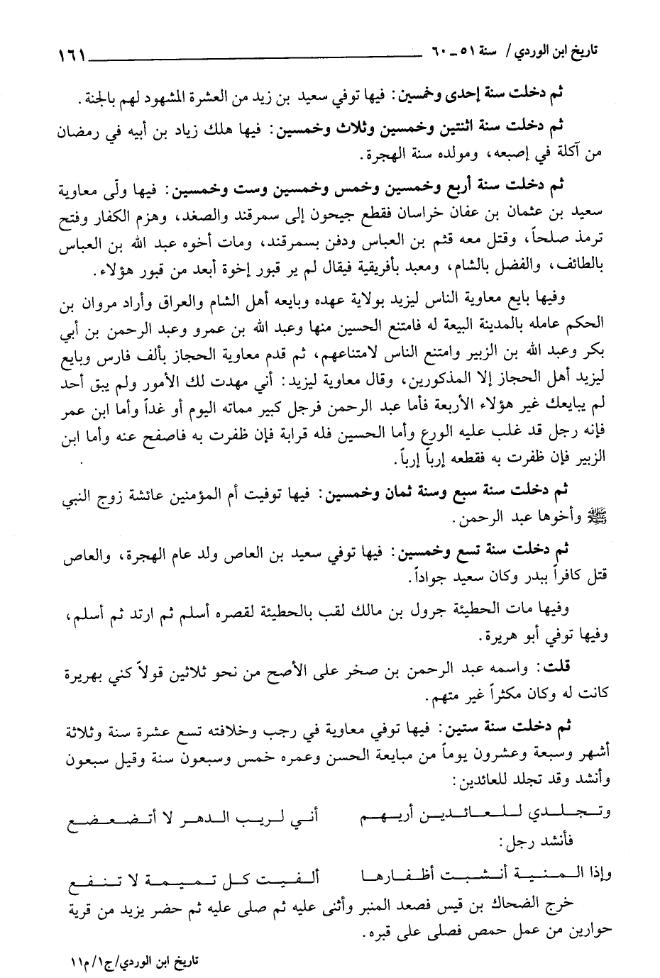 ثمَّ دخلت سنة سِتِّينَ: فِيهَا توفّي مُعَاوِيَة فِي رَجَب وخلافته تسع عشرَة سنة وَثَلَاثَة أشهر وَسَبْعَة وَعِشْرُونَ يَوْمًا من مبايعه الْحسن وعمره خمس وَسَبْعُونَ سنة وَقيل سَبْعُونَ وَأنْشد وَقد تجلد للعائدين: