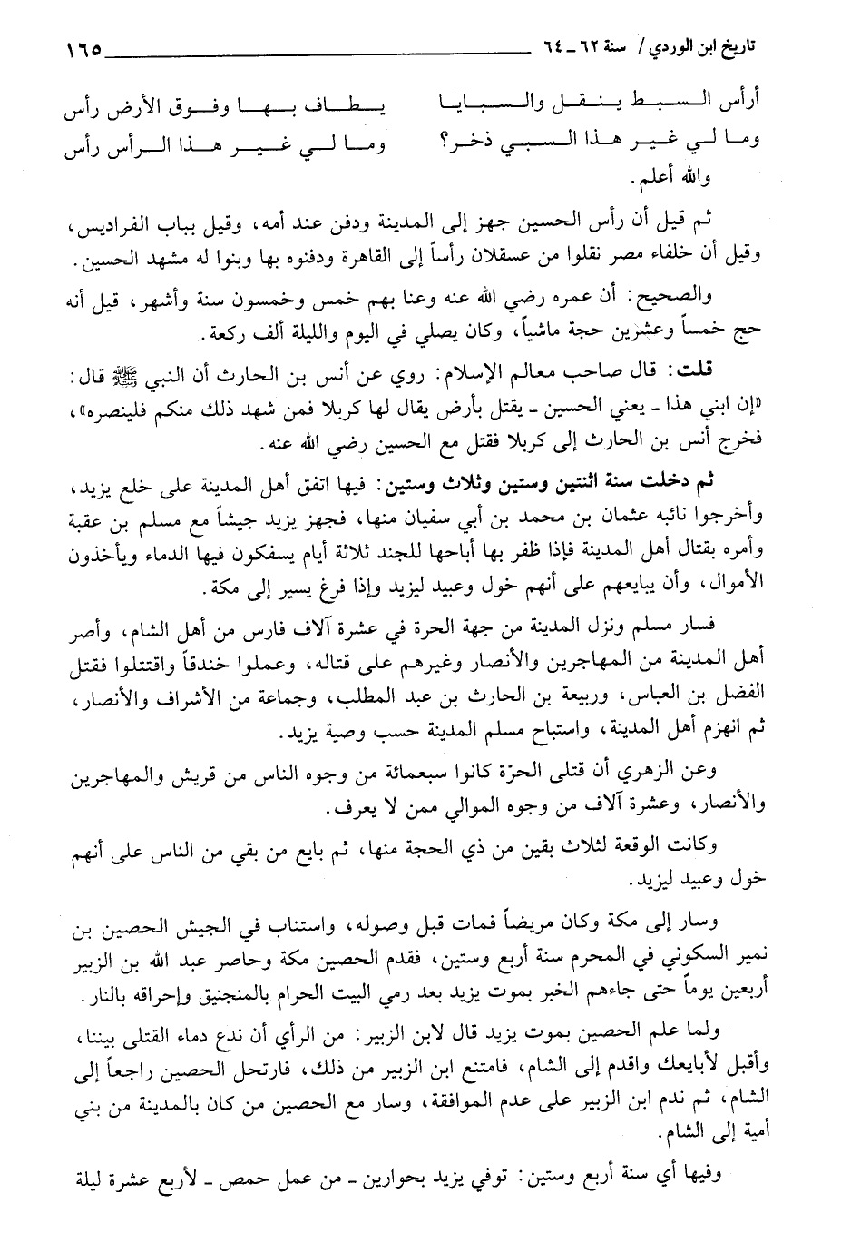 ثمَّ دخلت سنة اثْنَتَيْنِ وَسِتِّينَ وَثَلَاث وَسِتِّينَ: فِيهَا اتّفق أهل الْمَدِينَة على خلع يزِيد، وأخرجوا نَائِبه عُثْمَان بن مُحَمَّد بن أبي سُفْيَان مِنْهَا، فَجهز يزِيد جَيْشًا مَعَ مُسلم بن عقبَة وَأمره بِقِتَال أهل الْمَدِينَة فَإِذا ظفر بهَا أَبَاحَهَا للجند ثَلَاثَة أَيَّام يسفكون فِيهَا الدِّمَاء وَيَأْخُذُونَ الْأَمْوَال، وَأَن يبايعهم على أَنهم خول وَعبيد ليزِيد وَإِذا فرغ يسير إِلَى مَكَّة.