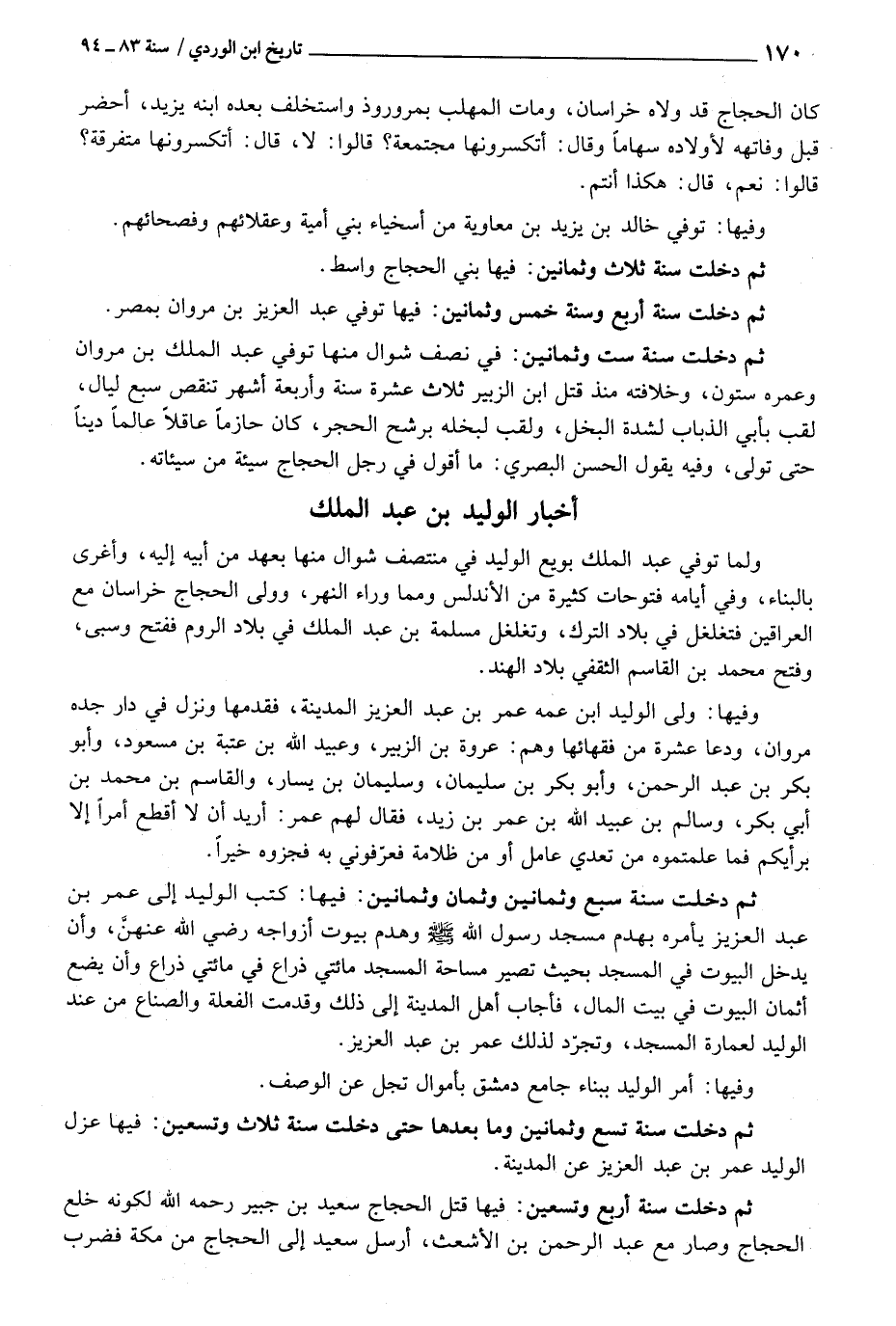 ثمَّ دخلت سنة تسع وَثَمَانِينَ وَمَا بعْدهَا حَتَّى دخلت سنة ثَلَاث وَتِسْعين: فِيهَا عزل الْوَلِيد عمر بن عبد الْعَزِيز عَن الْمَدِينَة.
