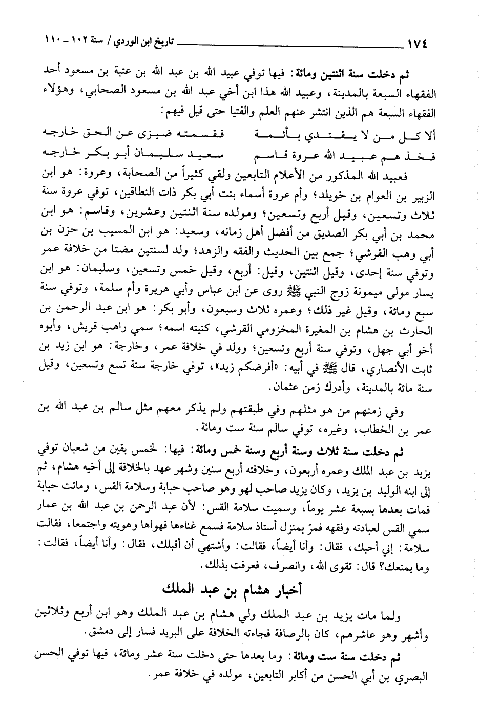 ثمَّ دخلت سنة اثْنَتَيْنِ وَمِائَة: فِيهَا توفّي عبيد اللَّهِ بن عبد اللَّهِ بن عتبَة بن مَسْعُود أحد الْفُقَهَاء السَّبْعَة بِالْمَدِينَةِ، وَعبيد اللَّهِ هَذَا ابْن أخي عبد اللَّهِ بن مَسْعُود الصَّحَابِيّ، وَهَؤُلَاء الْفُقَهَاء السَّبْعَة هم الَّذين انْتَشَر عَنْهُم الْعلم والفتيا حَتَّى قيل فيهم: