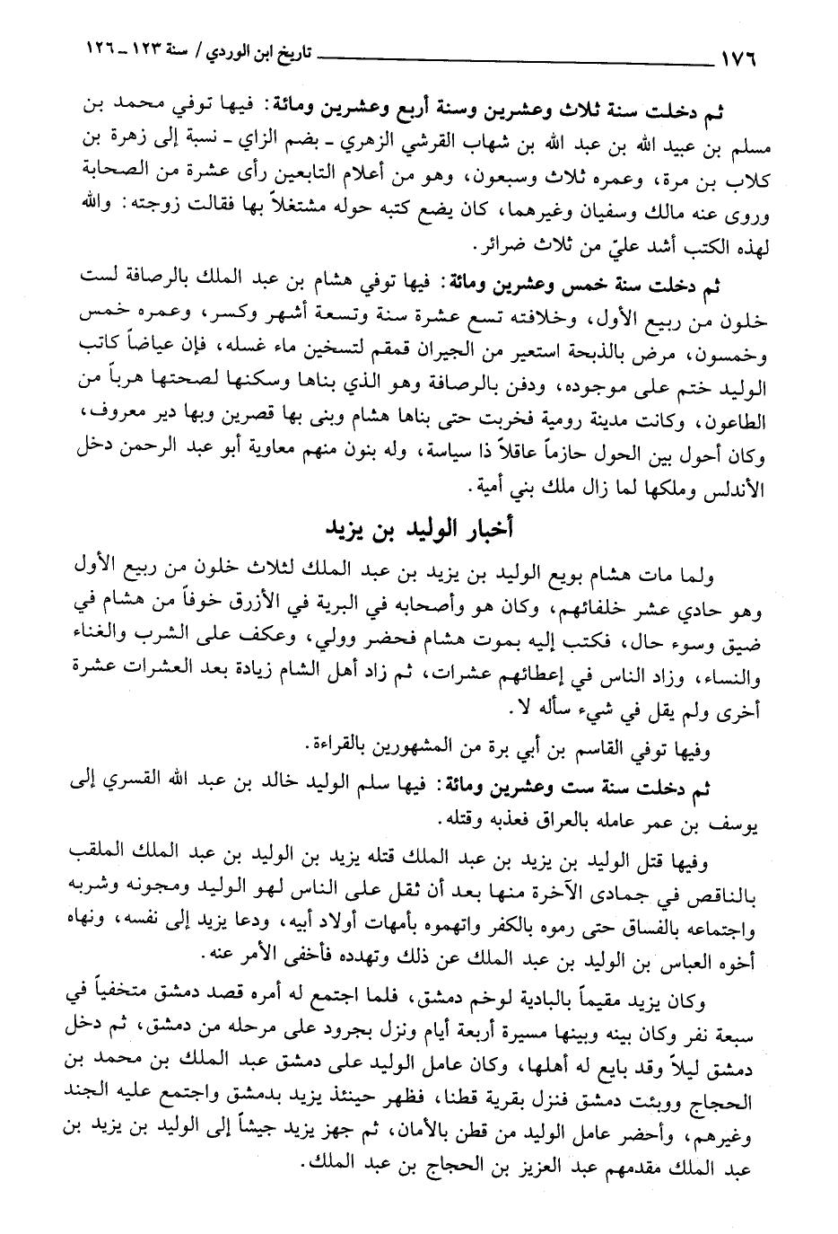 ثمَّ دخلت سنة خمس وَعشْرين وَمِائَة: فِيهَا توفّي هِشَام بن عبد الْملك بالرصافة لست خلون من ربيع الأول، وخلافته تسع عشرَة سنة وَتِسْعَة أشهر وَكسر، وعمره خمس وَخَمْسُونَ، مرض بالذبحة استعير من الْجِيرَان قمقم لتسخين مَاء غسله، فَإِن عياضا كَاتب الْوَلِيد ختم على موجوده، وَدفن بالرصافة وَهُوَ الَّذِي بناها وسكنها لصحتها هربا من الطَّاعُون، وَكَانَت مَدِينَة رُومِية فخربت حَتَّى بناها هِشَام وَبنى بهَا قَصْرَيْنِ وَبهَا دير مَعْرُوف، وَكَانَ أَحول بَين الْحول حازما عَاقِلا ذَا سياسة، وَله بنُون مِنْهُم مُعَاوِيَة أَبُو عبد الرَّحْمَن دخل الأندلس وملكها لما زَالَ ملك بني أُميَّة.