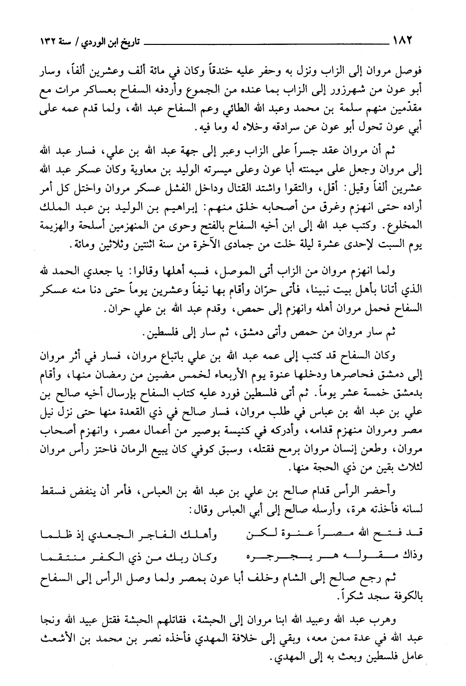 وَكَانَ السفاح قد كتب إِلَى عَمه عبد اللَّهِ بن عَليّ بِاتِّبَاع مَرْوَان، فَسَار فِي أثر مَرْوَان إِلَى دمشق فحاصرها ودخلها عنْوَة يَوْم الْأَرْبَعَاء لخمس مضين من رَمَضَان مِنْهَا، وَأقَام بِدِمَشْق خَمْسَة عشر يَوْمًا. ثمَّ أَتَى فلسطين فورد عَلَيْهِ كتاب السفاح بإرسال أَخِيه صَالح بن عَليّ بن عبد اللَّهِ بن عَبَّاس فِي طلب مَرْوَان، فَسَار صَالح فِي ذِي الْقعدَة مِنْهَا حَتَّى نزل نيل مصر ومروان مُنْهَزِم قدامه، وأدركه فِي كَنِيسَة بوصير من أَعمال مصر، وَانْهَزَمَ أَصْحَاب مَرْوَان، وَطعن إِنْسَان مَرْوَان بِرُمْح فَقتله، وَسبق كُوفِي كَانَ يَبِيع الرُّمَّان فاحتز رَأس مَرْوَان لثلاث بَقينَ من ذِي الْحجَّة مِنْهَا.