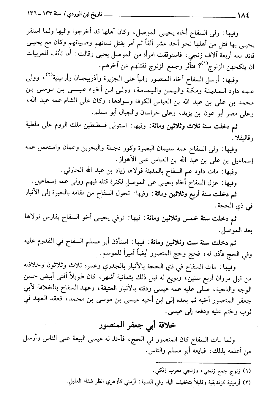 ثمَّ دخلت سنة أَربع وَثَلَاثِينَ وَمِائَة: وفيهَا: تحول السفاح من مقَامه بِالْحيرَةِ إِلَى الأنبار فِي ذِي الْحجَّة.