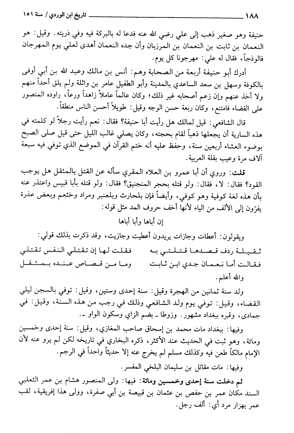 وفيهَا: بِبَغْدَاد مَاتَ مُحَمَّد بن إِسْحَاق صَاحب الْمَغَازِي، وَقيل: سنة إِحْدَى وَخمسين وَمِائَة، وَهُوَ ثَبت فِي الحَدِيث عِنْد الْأَكْثَر، ذكره البُخَارِيّ فِي تَارِيخه لَكِن لم يرو عَنهُ لِأَن الإِمَام مَالِكًا طعن فِيهِ وَكَذَلِكَ مُسلم لم يخرج عَنهُ إِلَّا حَدِيثا وَاحِدًا فِي الرَّجْم.