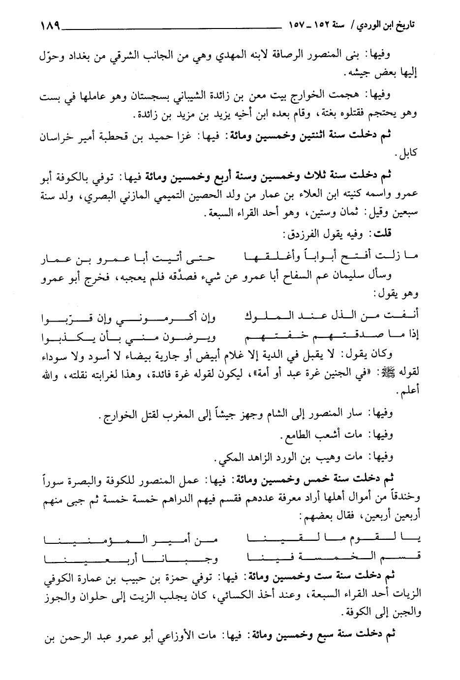ثمَّ دخلت سنة ثَلَاث وَخمسين وَسنة أَربع وَخمسين وَمِائَة فِيهَا: توفّي بِالْكُوفَةِ أَبُو عَمْرو واسْمه كنيته ابْن الْعَلَاء، بن عمار من ولد الْحصين التَّمِيمِي الْمَازِني الْبَصْرِيّ، ولد سنة سبعين وَقيل: ثَمَان وَسِتِّينَ، وَهُوَ أحد الْقُرَّاء السَّبْعَة.