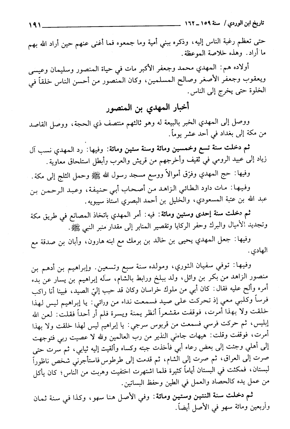 ثمَّ دخلت سنة إِحْدَى وَسِتِّينَ وَمِائَة: فِيهِ: أَمر الْمهْدي باتخاذ المصانع فِي طَرِيق مَكَّة وتجديد الأميال والبرك وحفر الركايا وتقصير المنابر إِلَى مِقْدَار مِنْبَر النَّبِي - صَلَّى اللَّهُ عَلَيْهِ وَسَلَّم َ -.