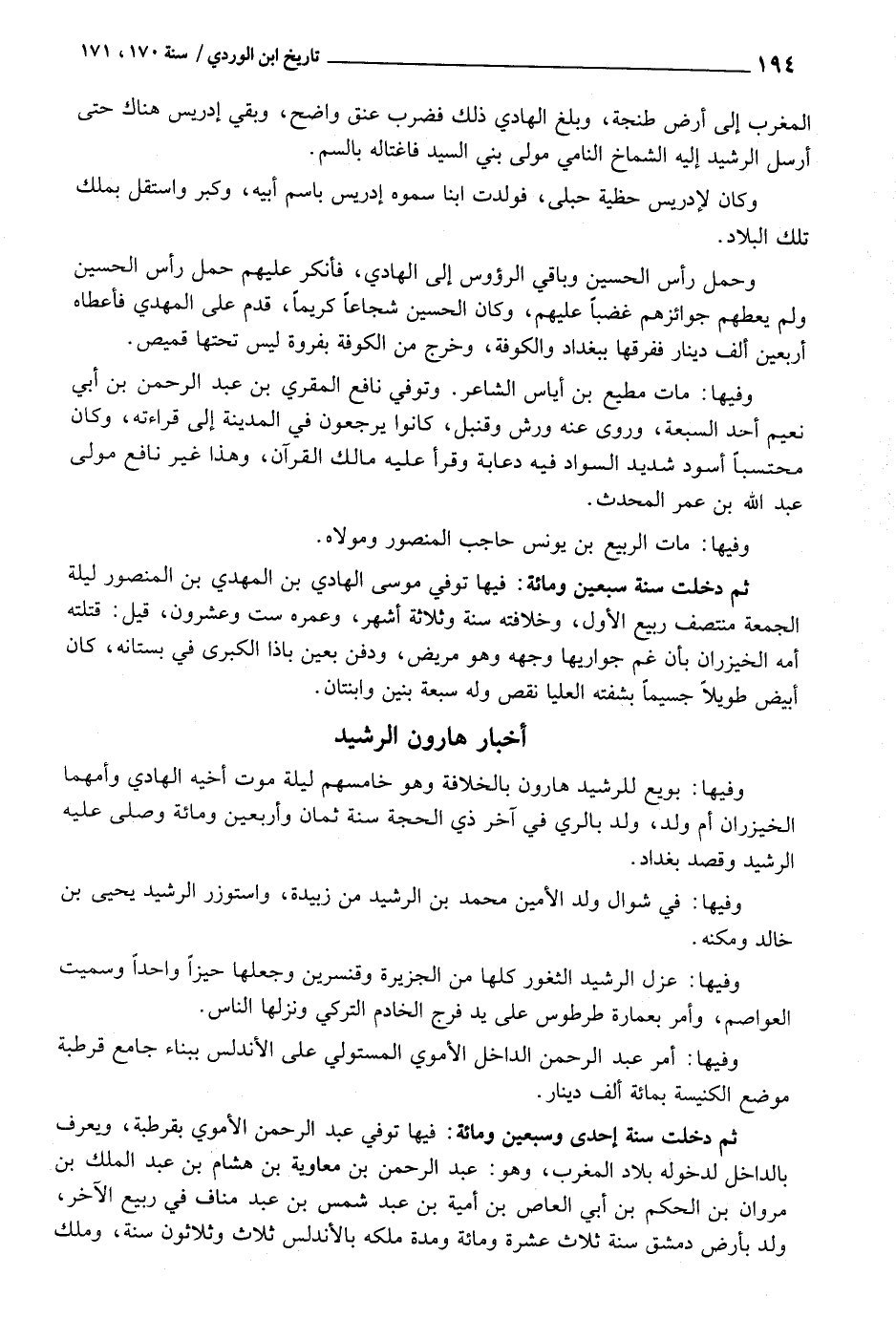 وفيهَا: بُويِعَ للرشيد هَارُون بالخلافة وَهُوَ خامسهم لَيْلَة موت أَخِيه الْهَادِي وأمهما الخيزران أم ولد، ولد بِالريِّ فِي آخر ذِي الْحجَّة سنة ثَمَان وَأَرْبَعين وَمِائَة وَصلى عَلَيْهِ الرشيد وَقصد بَغْدَاد.