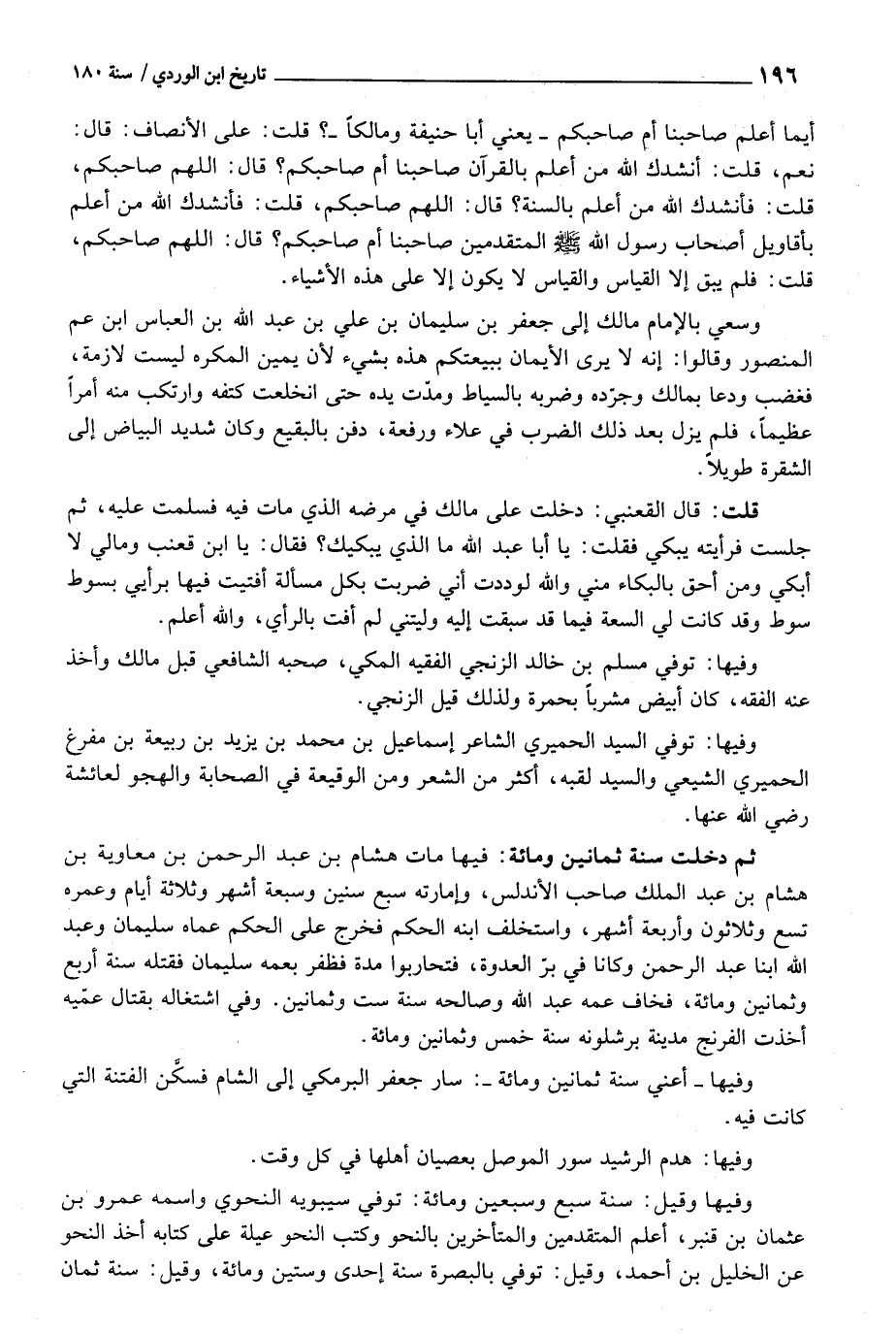 ثمَّ دخلت سنة ثَمَانِينَ وَمِائَة: فِيهَا مَاتَ هِشَام بن عبد الرَّحْمَن بن مُعَاوِيَة بن هِشَام بن عبد الْملك صَاحب الأندلس، وإمارته سبع سِنِين وَسَبْعَة أشهر وَثَلَاثَة أَيَّام وعمره تسع وَثَلَاثُونَ وَأَرْبَعَة أشهر، واستخلف ابْنه الحكم فَخرج على الحكم عماه سُلَيْمَان وَعبد اللَّهِ ابْنا عبد الرَّحْمَن وَكَانَا فِي بر العدوة، فتحاربوا مُدَّة فظفر بِعَمِّهِ سُلَيْمَان فَقتله سنة أَربع وَثَمَانِينَ وَمِائَة، فخاف عَمه عبد اللَّهِ وَصَالَحَهُ سنة سِتّ وَثَمَانِينَ. وَفِي اشْتِغَاله بِقِتَال عميه أخذت الفرنج مَدِينَة برشلونه سنة خمس وَثَمَانِينَ وَمِائَة.