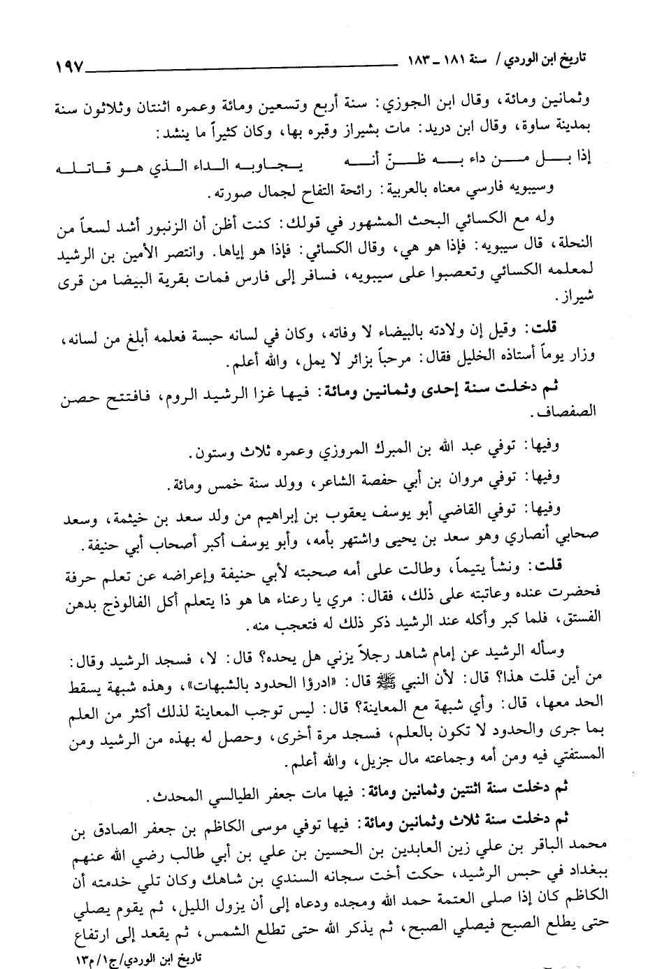 ثمَّ دخلت سنة ثَلَاث وَثَمَانِينَ وَمِائَة: فِيهَا توفّي مُوسَى الكاظم بن جَعْفَر الصَّادِق بن مُحَمَّد الباقر بن عَليّ زين العابدين بن الْحُسَيْن بن عَليّ بن أبي طَالب رَضِي اللَّهِ عَنْهُم بِبَغْدَاد فِي حبس الرشيد، حكت أُخْت سجانه السندي بن شاهك وَكَانَ تلِي خدمته أَن الكاظم كَانَ إِذا صلى الْعَتَمَة حمد اللَّهِ ومجده وَدعَاهُ إِلَى أَن يَزُول اللَّيْل، ثمَّ يقوم يُصَلِّي حَتَّى يطلع الصُّبْح فَيصَلي الصُّبْح، ثمَّ يذكر اللَّهِ حَتَّى تطلع الشَّمْس، ثمَّ يقْعد إِلَى ارْتِفَاع