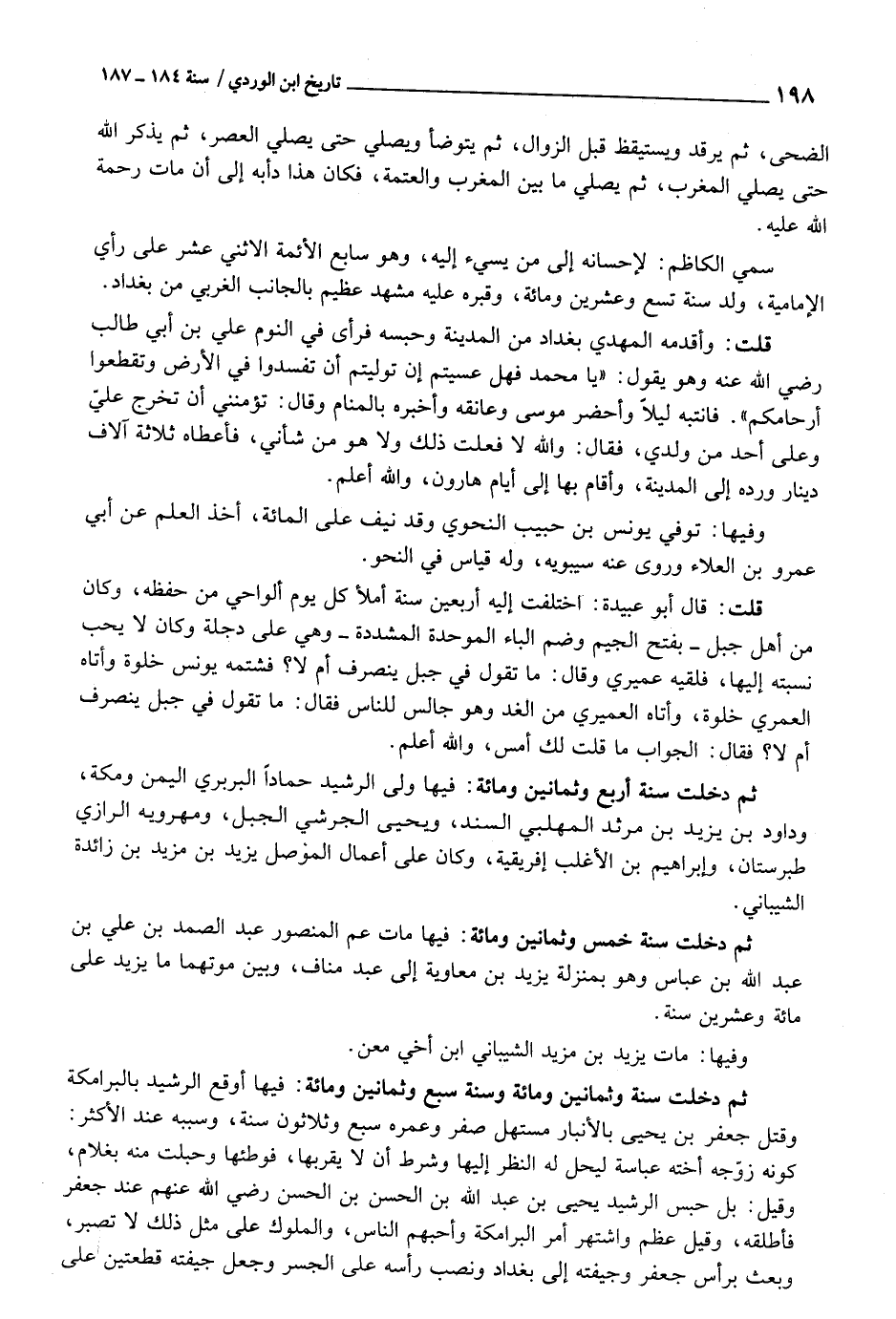 ثمَّ دخلت سنة وَثَمَانِينَ وَمِائَة وَسنة سبع وَثَمَانِينَ وَمِائَة: فِيهَا أوقع الرشيد بالبرامكة وَقتل جَعْفَر بن يحيى بالأنبار مستهل صفر وعمره سبع وَثَلَاثُونَ سنة، وَسَببه عِنْد الْأَكْثَر: كَونه زوجه أُخْته عباسة ليحل لَهُ النّظر إِلَيْهَا وَشرط أَن لَا يقربهَا، فَوَطِئَهَا وحبلت مِنْهُ بِغُلَام، وَقيل: بل حبس الرشيد يحيى بن عبد اللَّهِ بن الْحسن بن الْحسن رَضِي اللَّهِ عَنْهُم عِنْد جَعْفَر فَأَطْلقهُ، وَقيل عظم واشتهر أَمر البرامكة وأحبهم النَّاس، والملوك على مثل ذَلِك لَا تصبر، وَبعث بِرَأْس جَعْفَر وجيفته إِلَى بَغْدَاد وَنصب رَأسه على الجسر وَجعل جيفته قطعتين على